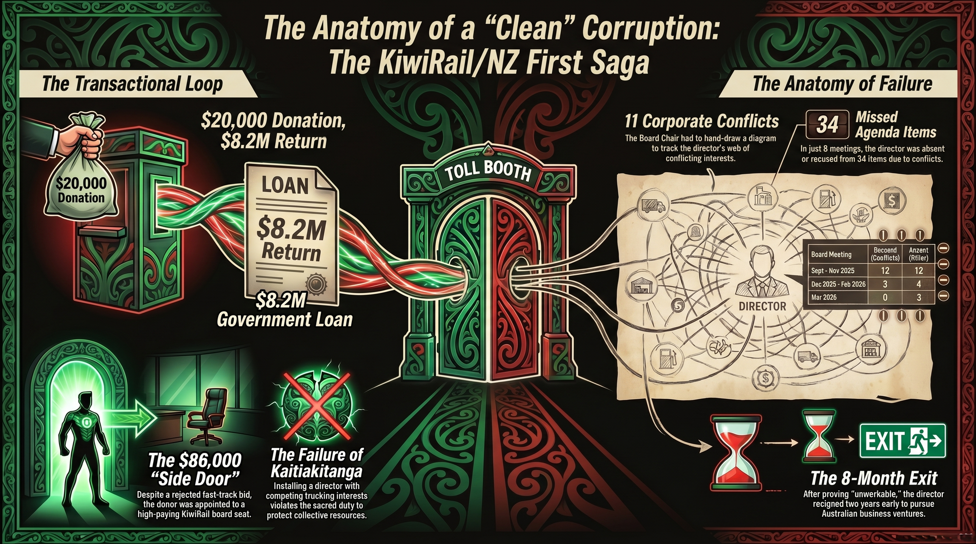The O'Donnell-KiwiRail saga is not an aberration. It is the operating system. NZ First — a party that received 6% of the vote — has used its coalition position to run a systematic programme of rewarding donors with Crown resources. The Provincial Growth Fund. The Regional Infrastructure Fund. The Fast Track Approvals process. The SOE boardrooms. All of it flowing, with careful documentation and a compliant Cabinet, toward those who fund the party.