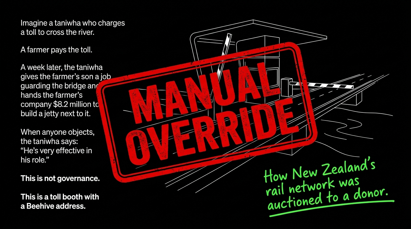 The whānau who depend on functioning, impartial public infrastructure — on rail that isn't governed by its own freight customers — won't be fine unless someone keeps naming this. This essay exists because you fund it. Not the Crown. Not a party donor. You.