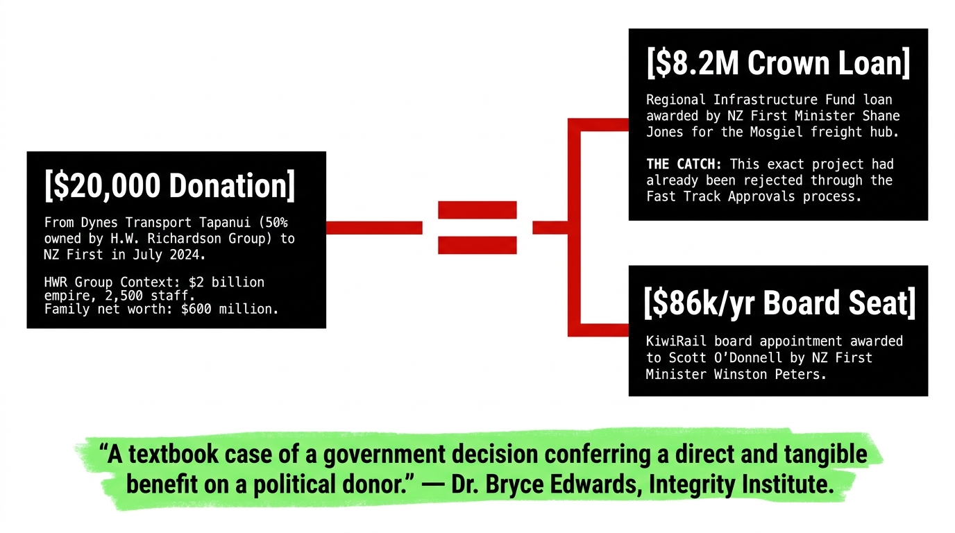 Shane Jones' Regional Infrastructure Fund is the direct successor to the Provincial Growth Fund — widely criticised during the 2017–2020 Labour-NZ First government as a political slush fund used to reward supporters. Same minister. Same fund. Same playbook. Different logo. A rival privately-funded inland port proposal — Calder Stewart's $3 billion Milburn project — was already in the pipeline, meaning there was no market failure requiring government intervention. As the Integrity Institute concluded, Minister Jones' decision was "not one of necessity, but of choice: a decision to use public money to subsidise one commercial player over another" — the one that had funded his party. The Clutha District Mayor expressed public frustration that the Mosgiel announcement came "out of the blue." The market didn't need fixing. The donor needed rewarding.