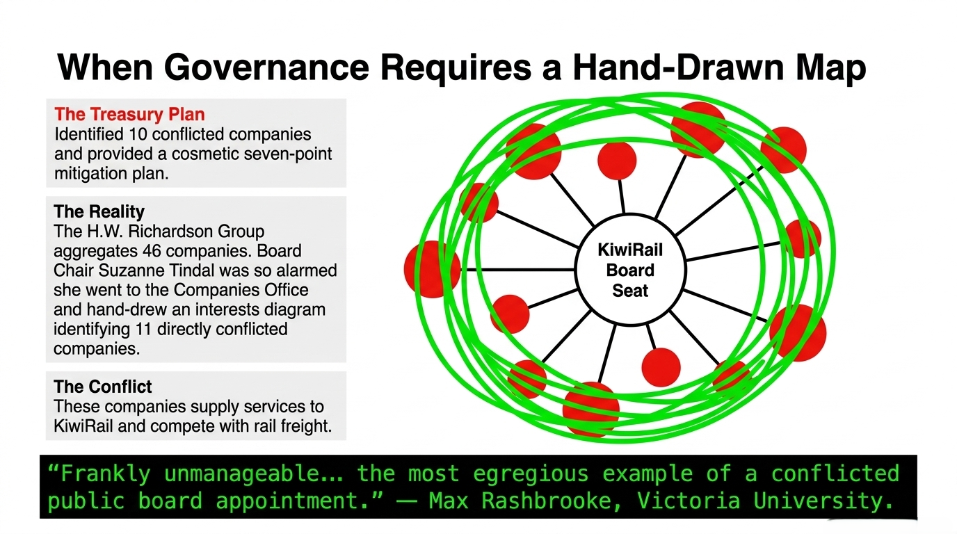 The H.W. Richardson Group aggregates 46 companies, employs approximately 2,500 people, and has an annual turnover of approximately $2 billion. The conflicts identified in O'Donnell's Treasury-managed plan included ten companies — let that settle for a moment. Ten companies. And they still proceeded. Board chair Tindal didn't wait for Treasury. She went to the Companies Office herself and hand-drew an interests diagram identifying 11 companies with conflicts. OIA documents reveal she was so alarmed she personally mapped the corporate web before formally raising her concerns. The minister ignored her.