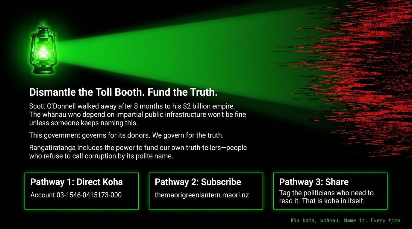 For more on how this government is systematically dismantling the institutions that protect Māori, see previous essays from The Māori Green Lantern: "Drill Baby, Drill — Into Your Own Fraud", which maps how the same coalition is strip-mining Te Tiriti alongside its resource extraction agenda; and the essay on "He Promised to Fix the Economy. He Broke the People.", which traces the human cost of these same neoliberal choices on whānau who cannot donate $20,000 to anyone.