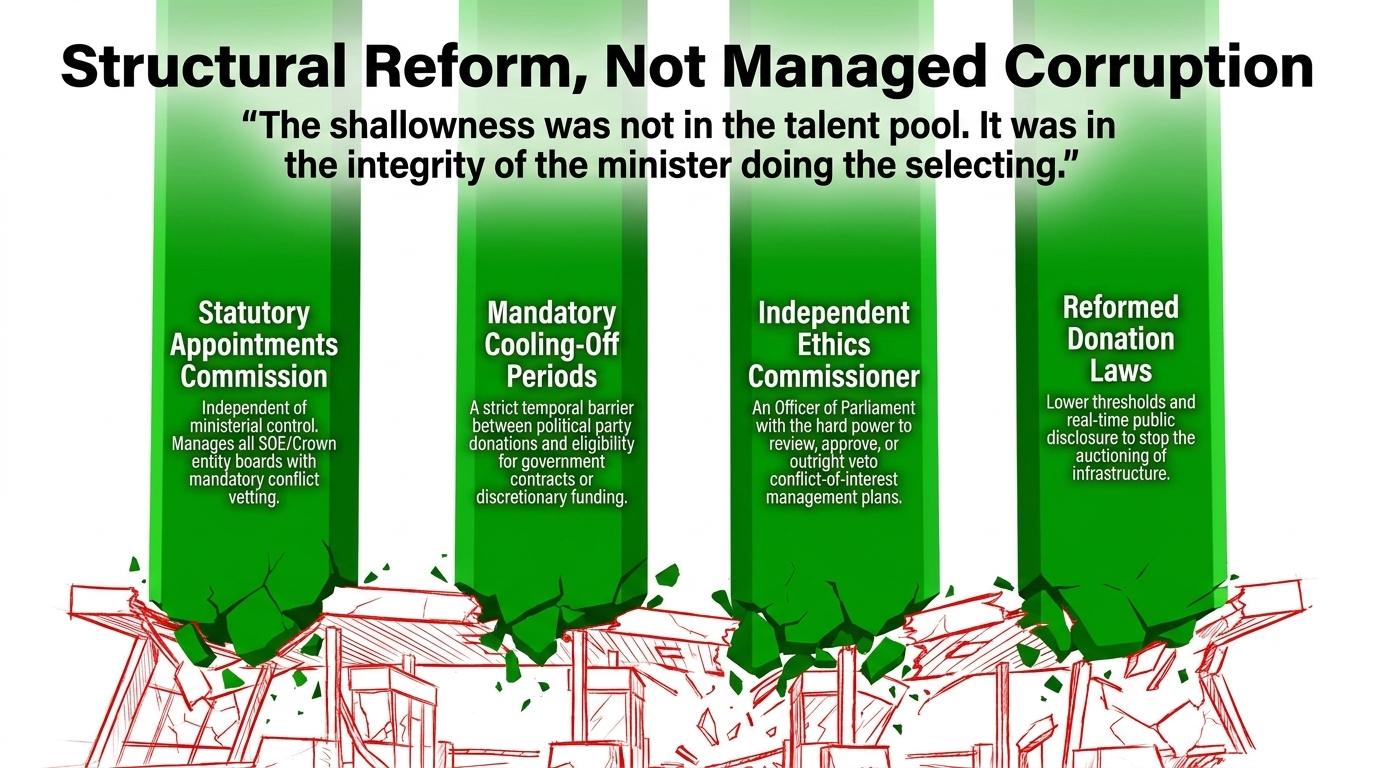 - A Statutory Appointments Commission — independent of ministerial control — to manage all SOE and Crown entity board appointments through open recruitment, with mandatory conflict vetting and pre-approved shortlists