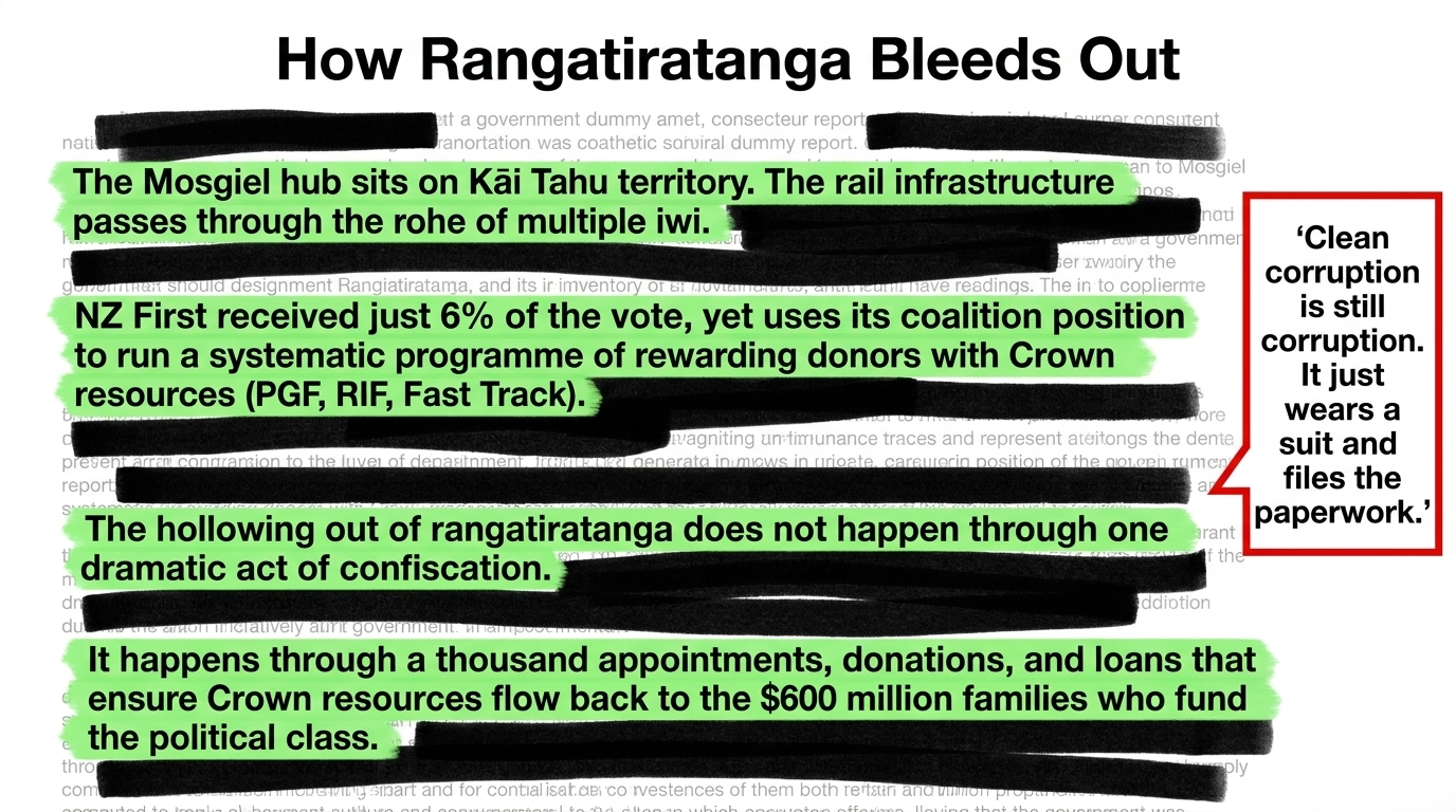 The Mosgiel hub sits on Kāi Tahu territory. The rail infrastructure passes through the rohe of multiple iwi. When Crown infrastructure loans flow to projects that have been rejected on their merits, when board seats are purchased through party donations, when conflicts are "managed" rather than eliminated