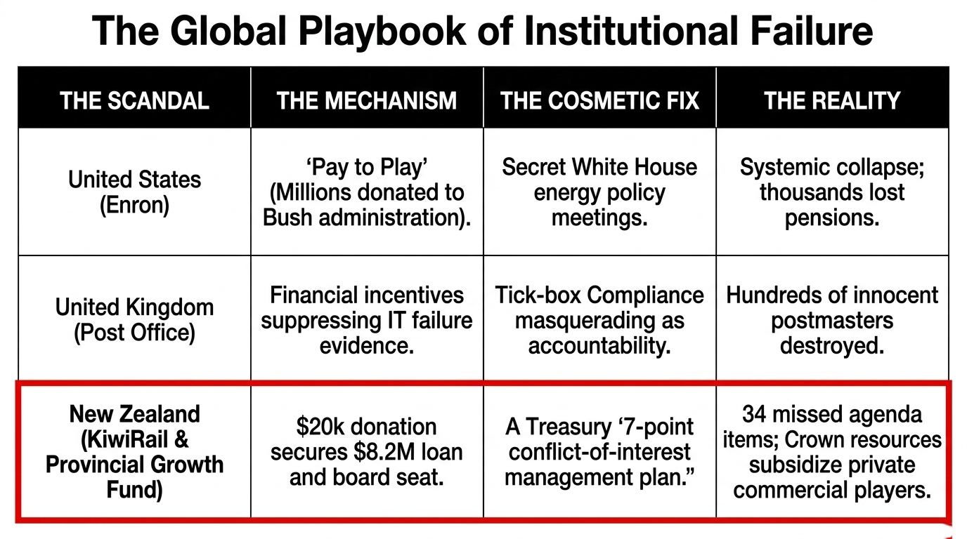 In the United States, this is called "pay to play." When Enron donated millions to the Bush administration and its energy executives literally co-wrote U.S. energy policy in secret White House meetings, the world called it corruption. When it collapsed, thousands lost their pensions. The mechanism here is identical — only the dollar amounts are smaller, and the New Zealand media is polite enough to call it a "conflict of interest management plan" rather than what it is. As the Integrity Institute documents, a private freight company that donated $20k to a governing party received $8.2 million in Crown funding through a discretionary fund controlled by a single minister from that same party — after being rejected through the multi-minister oversight process. The lesson: when the front door has scrutiny, a donation buys a side door.