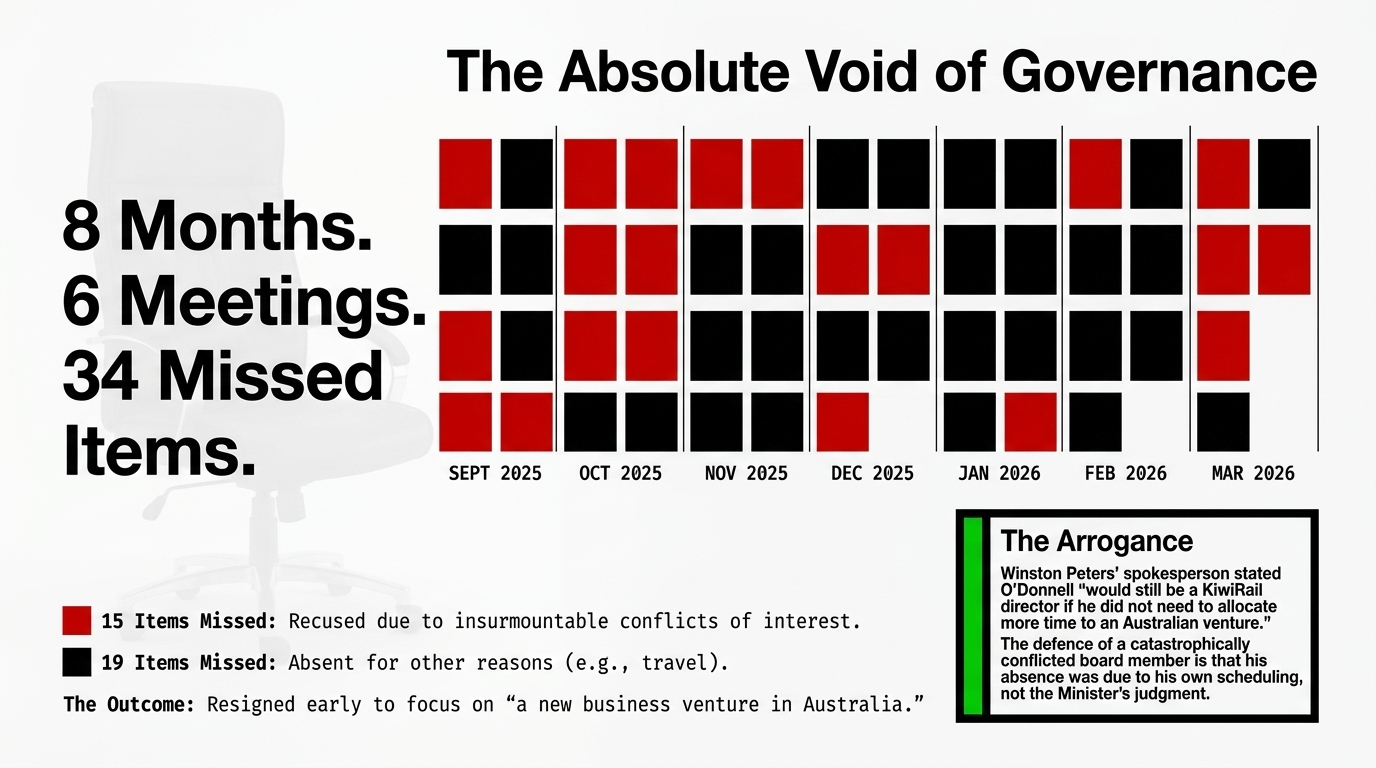 Thirty-four agenda items. Six meetings. Eight months. Then gone — to "a new business venture in Australia." The board chair told Parliament during scrutiny week in December 2025 that O'Donnell's conflicts of interest were affecting the board's capability and efficiency — and reminded the MPs present, with notable precision, that she did not appoint directors. Victoria University's Max Rashbrooke called it the most egregious example of a conflicted public board appointment he had ever seen, describing the conflicts as "frankly unmanageable." ACT MP Simon Court — hardly a radical — acknowledged the appointment had proven "unworkable," and that the board had made every effort to work around conflicts that were fundamentally too extensive to manage.