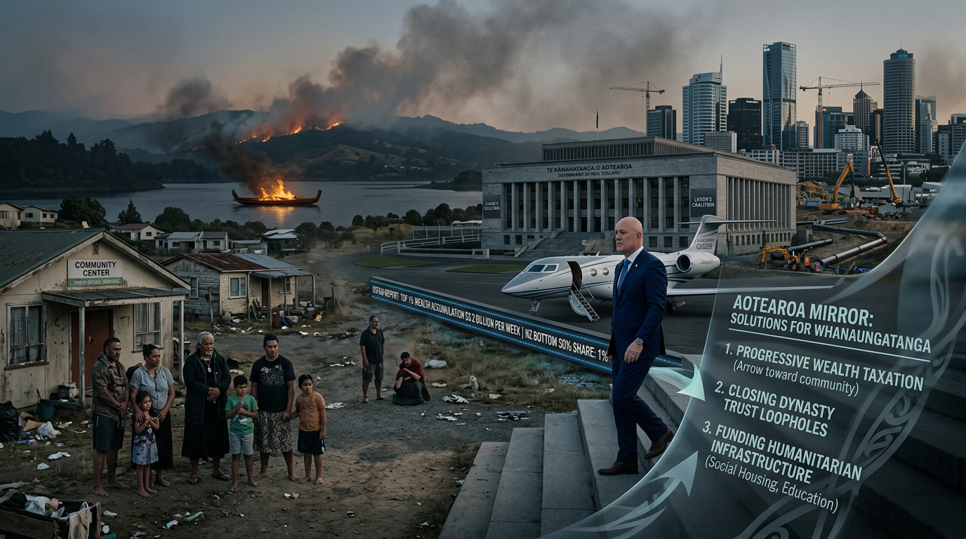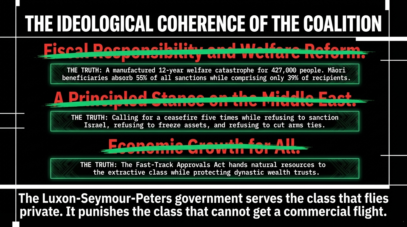 In Aotearoa, the same structure operates in slow motion. As The Māori Green Lantern exposed in "Ko te Taniwha Kei Roto i te Whare" — Luxon's Coalition of Cruelty manufactured a 12-year welfare catastrophe affecting 427,000 people while the same government defunded Māori social infrastructure and handed resources to corporate interests. The same Luxon government that cannot find words strong enough to sanction Israel — as 1News documented, Winston Peters called for a ceasefire for the fifth time in two years while refusing to sanction, expel, or cut arms ties — that same government provides tax policy that allows the Aotearoa-based ultra-wealthy to shelter their golden escape capital in trusts, property portfolios, and Roth IRA equivalents.