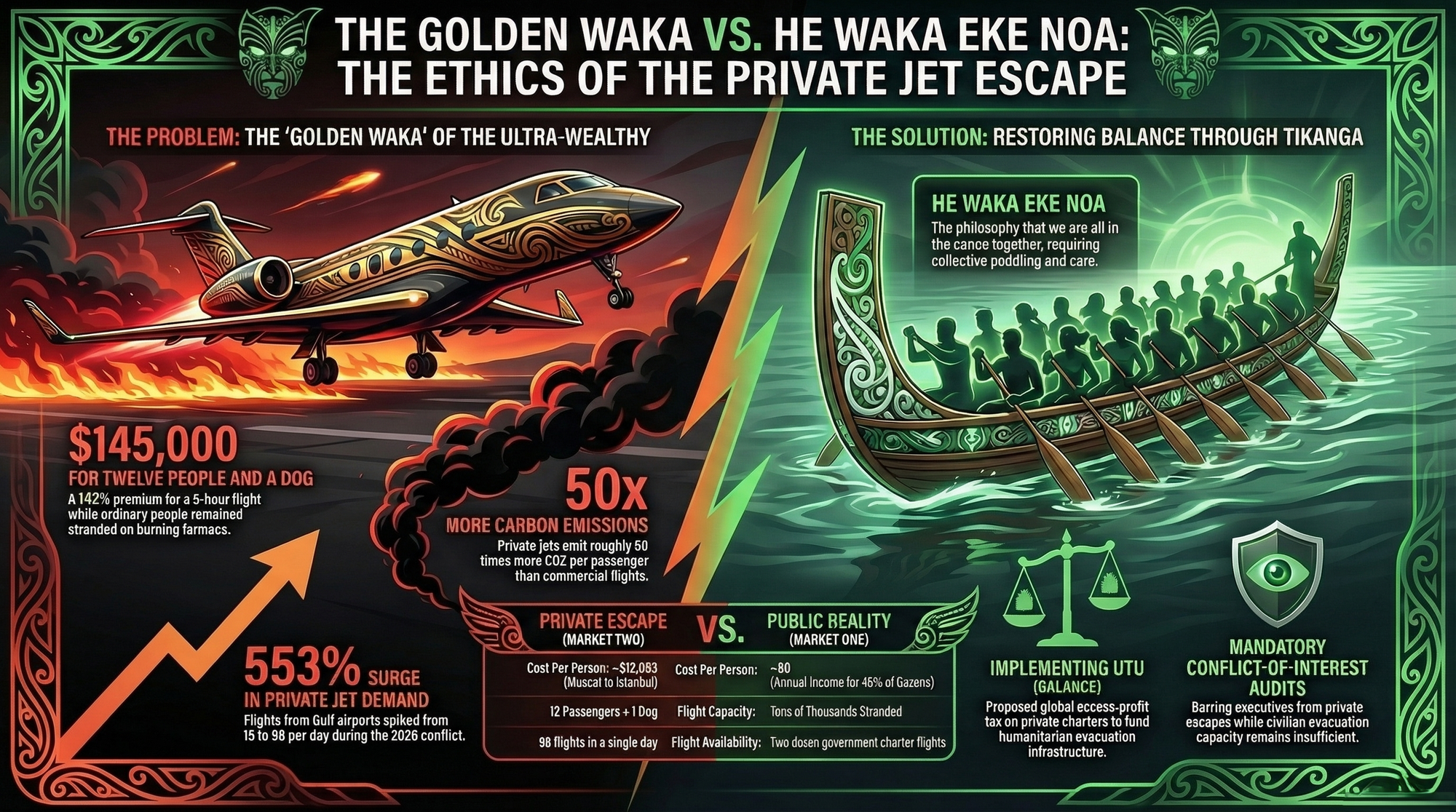 The tikanga violation: This is the destruction of whanaungatanga — the fundamental obligation of kinship and mutual care. In a world governed by tikanga, no member of the community escapes alone while others burn. The waka carries everyone or it carries no one. The ultra-wealthy have built a waka that carries twelve people and a dog, charges $145,000 for the privilege, and leaves tens of thousands standing on the burning tarmac.