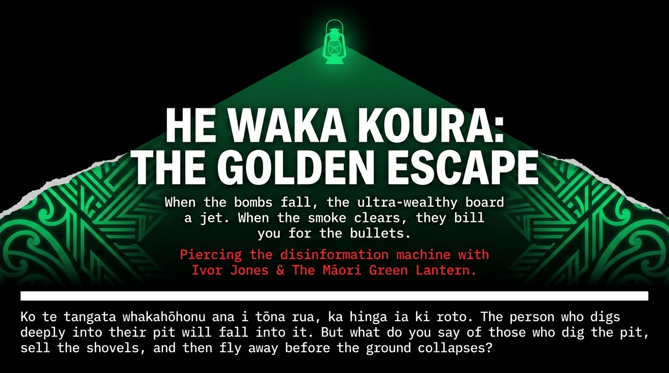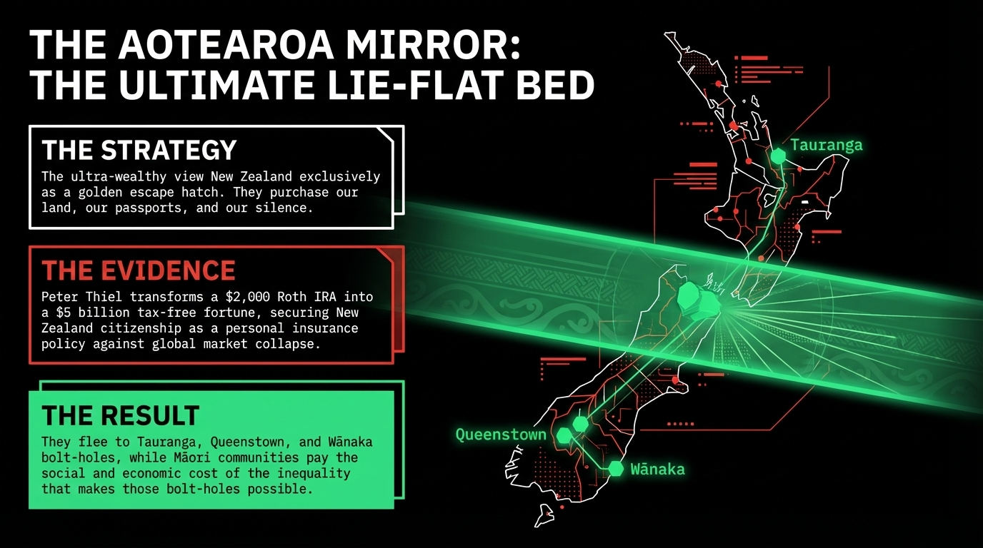 As The Māori Green Lantern documented in "The Butcher, the Baker, and the Blackmail Maker", the ultra-wealthy — including Peter Thiel, who transformed a $2,000 Roth IRA into a $5 billion tax-free fortune and purchased New Zealand citizenship as a bolt-hole — view Aotearoa as precisely this: a golden escape hatch for when their own wars and their own market collapses threaten their comfort.
