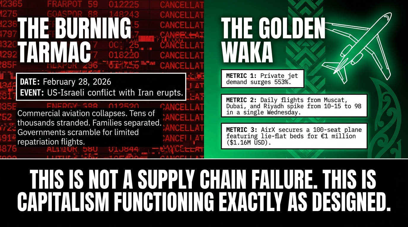 Twelve people and a dog just paid USD$145,000 to fly from Muscat to Istanbul — a 142 percent premium over peacetime rates — as reported by RNZ. The same journey that once cost $60,000. And while those twelve gold-waka passengers sipped whatever the ultra-wealthy sip above a burning region, tens of thousands of ordinary people remained stranded below — grounded by the same airspace closures, the same missile corridors, the same geopolitical carnage that the class of the twelve helped finance, profit from, and will profit from again once the dust settles.