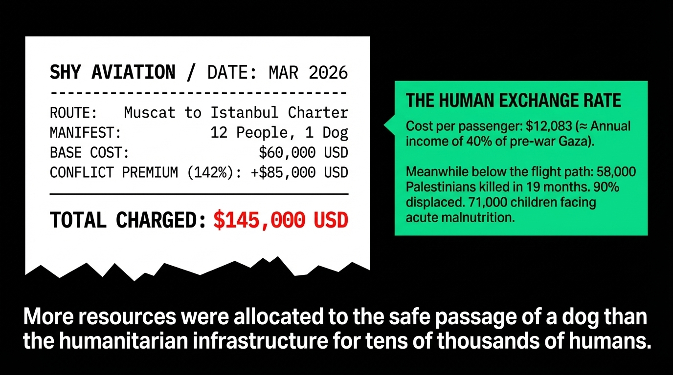 One flight. Twelve people. One dog. $145,000 USD. That is $12,083 per person — roughly the annual income of approximately 40 percent of Gazans before the conflict, before the siege, before the rubble. As 1News reported in July 2025 citing Peeni Henare, 58,000 Palestinians had been killed in 19 months, 90% of Gaza's population displaced, and 71,000 children under 5 facing acute malnutrition. The dog on that private jet departed a conflict zone with more resources allocated to its safe passage than the entire humanitarian infrastructure serving hundreds of thousands of displaced Palestinian families.