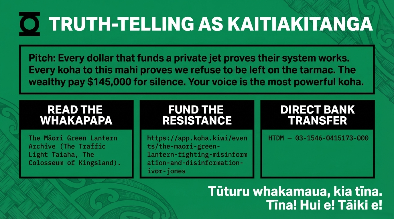 If you cannot koha — no worries at all. Share this essay with your whānau. Post it. Kōrero about it. Tag someone who needs to read it. In a world where the wealthy pay $145,000 for silence, your voice in circulation is the most powerful koha of all.