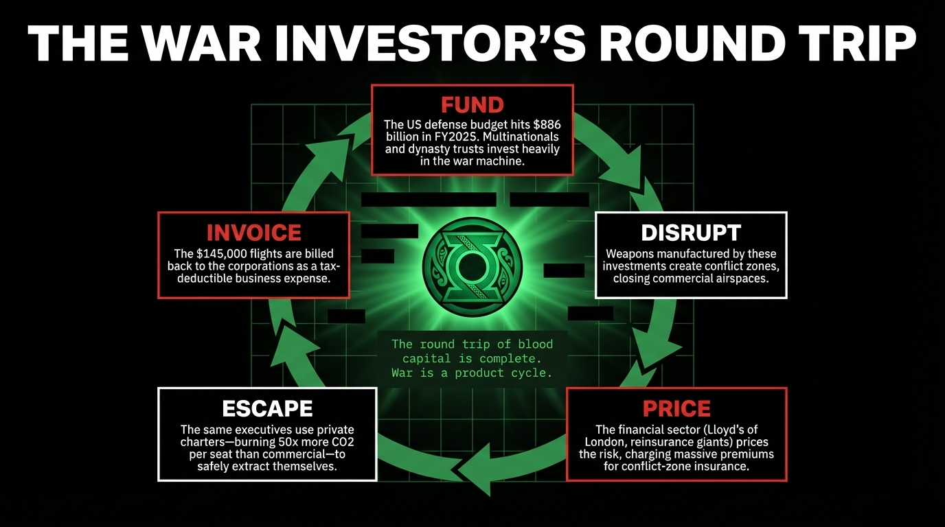 The companies that manufacture the weapons creating the airspace closures are the same financial ecosystem whose senior executives are being "relocated" by private charter. As RNZ notes, demand includes "multinational corporations relocating senior executives." Multinational corporations with Gulf operations include defence contractors, energy companies, and logistics firms whose supply chains and political lobbying directly shape the military conflicts now threatening their executives' safety. The US military-industrial complex — Lockheed Martin, Raytheon, Boeing — posted record revenues in 2024 off the back of expanded Middle East conflict. Their shareholders are in those lie-flat seats. Their weapons are in the missile systems that closed the airports their private jets are now escaping.