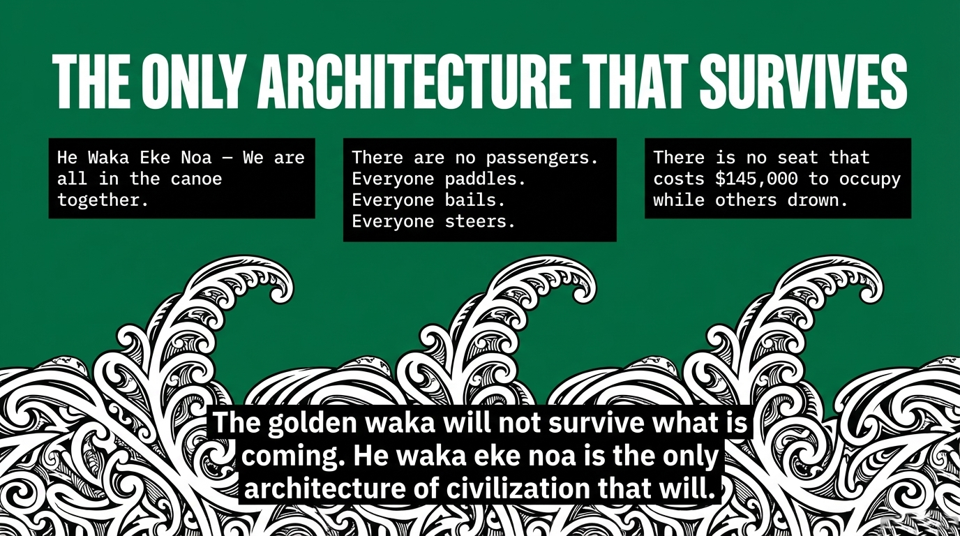 For the western mind, the central message is this — in te ao Māori, he waka eke noa, we are all in the canoe together, and a civilisation that builds a golden waka for twelve while leaving tens of thousands to drown has not failed. It has succeeded, exactly as designed.
