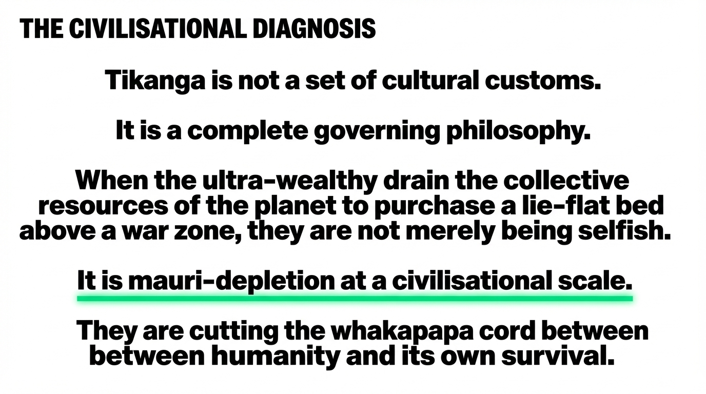 Tikanga says: your wellbeing is inseparable from the wellbeing of the collective. The mauri — the life force — of each person is bound to the mauri of the group, the land, the water, the sky. When one part of that system is depleted, all parts suffer. When the ultra-wealthy drain the collective mauri to purchase a lie-flat bed above a war zone, they are not merely being selfish. In the framework of tikanga, they are committing mauri-depletion at a civilisational scale. They are cutting the whakapapa cord between humanity and its own survival instinct.
