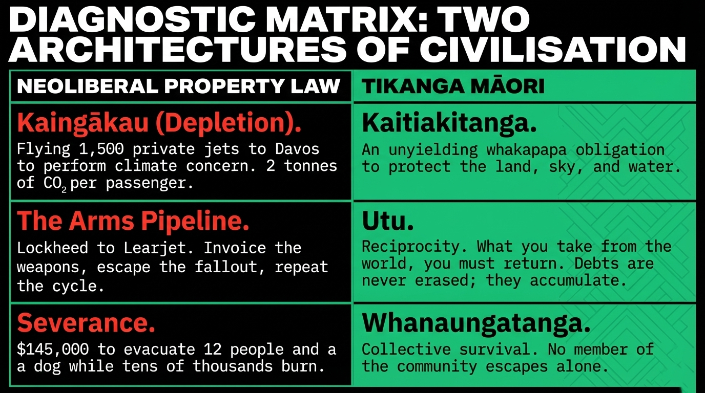 As previously documented in "The Colonial Attack on Tikanga" — where David Seymour and Sean Plunket's campaign to strip tikanga from New Zealand courts was exposed — the colonial project has always been to replace relational, reciprocal law with property law. Private jets are property law made aerodynamic. $145,000 is property law made into an evacuation policy. The dog with the lie-flat seat is property law made obscene.