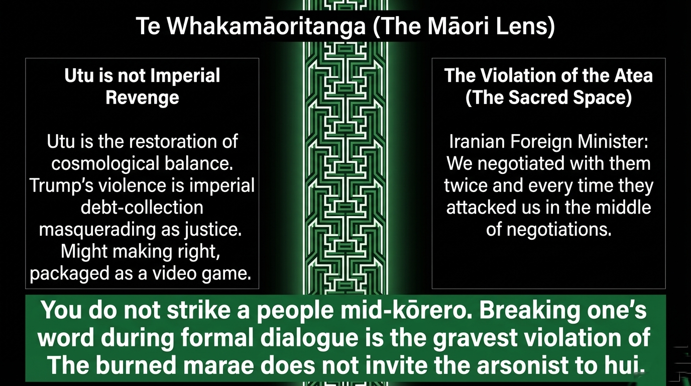 In te ao Māori, utu is not simple revenge. It is the restoration of cosmological balance — the re-alignment of relationships that have been violated. Both Iran and the United States believe they are enacting utu. The difference is scale. The difference is who started it.