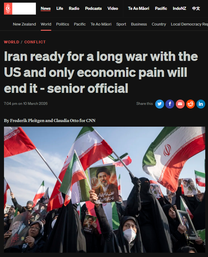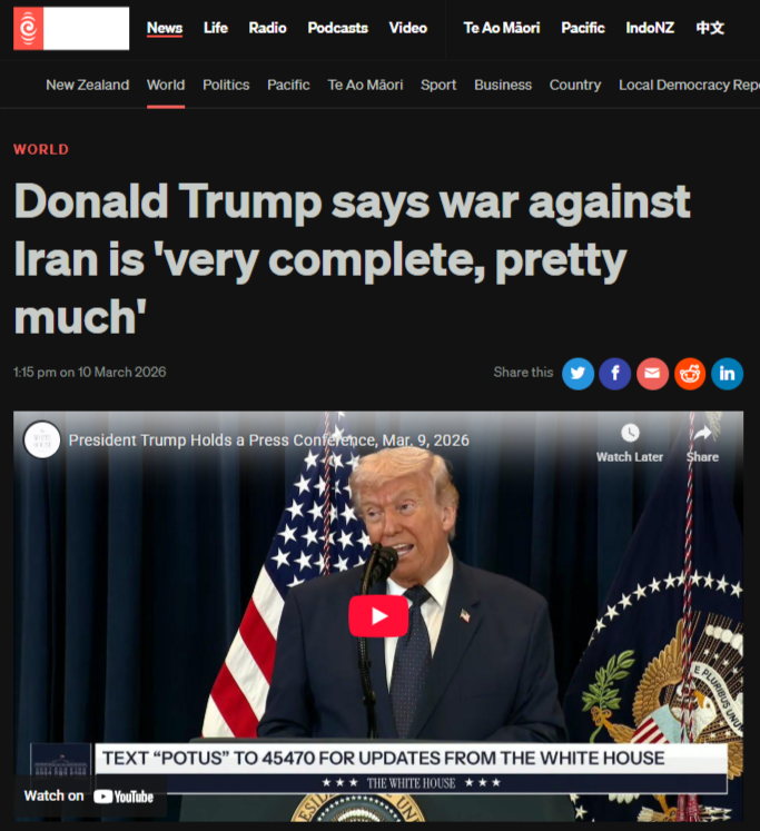 Crucially, 1News confirmed on 2 March that US intelligence did not suggest Iran was planning a preemptive strike before Washington and Tel Aviv launched their attacks. Trump later told reporters, as 1News documented on 10 March, that the war started because Iran "was starting work on a new site for developing material for nuclear weapons" — a claim directly contradicted by the fact that Iran's existing nuclear sites were already destroyed in the June 2025 Twelve-Day War. As RNZ reported on 2 March, drawing on Reuters analysis, Trump's stated objectives have shifted constantly: nuclear capability, missile stockpiles, proxy networks, regime change, and finally — most revealingly — that he had "someone in mind" to lead Iran but wouldn't say who. This is not a war with strategy. This is a war with ambitions searching for justification.