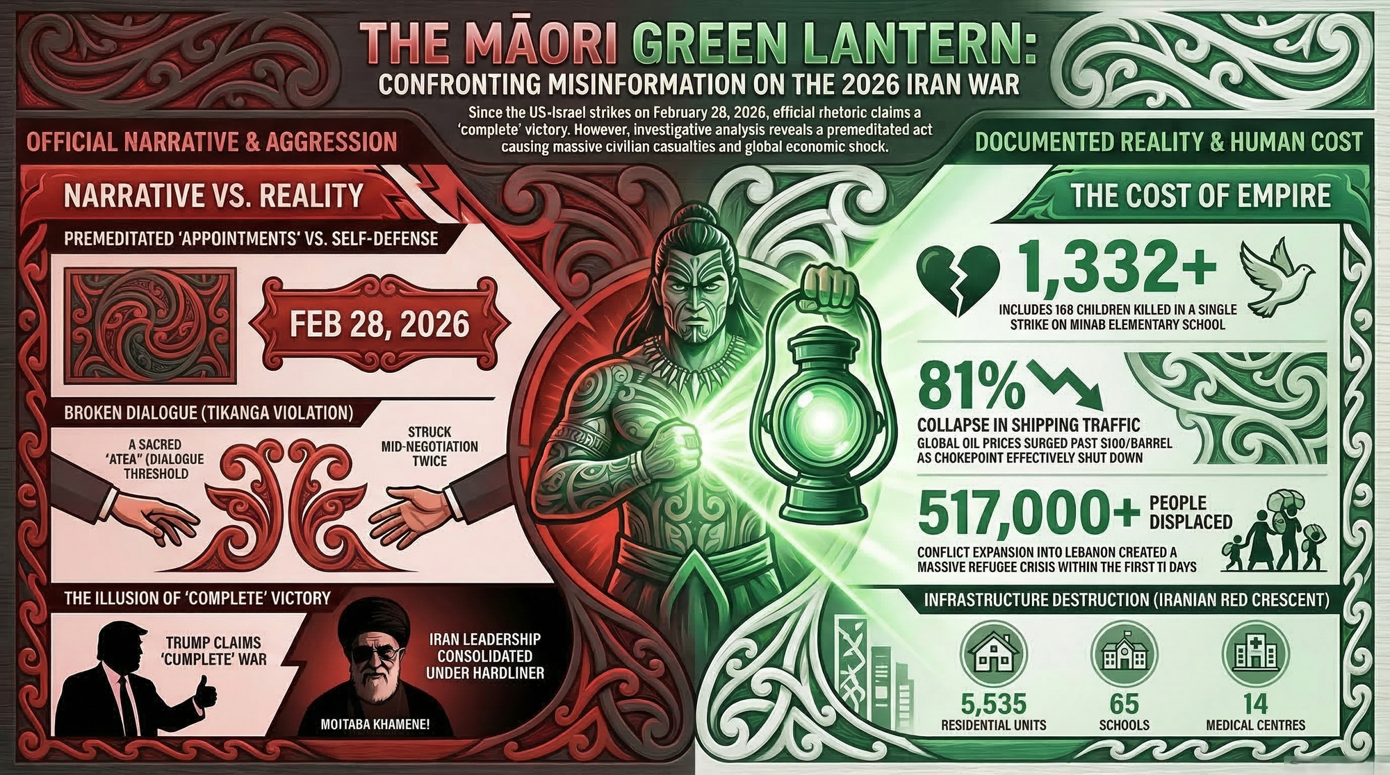 The Māori Green Lantern does not pretend to love the Iranian theocracy. The Islamic Republic carries its own account with its own people. But the question of who has the right to obliterate a nation — to kill its Supreme Leader, destroy its navy, bomb its schools, choke its civilians — is not answered by pointing to the regime's sins. Colonisers have always named the chiefs they killed as tyrants. It made the killing no less wrong.