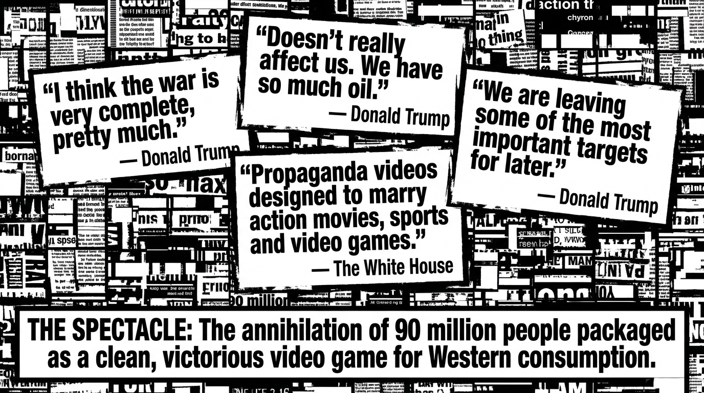 The White House has been producing war propaganda videos that, as 1News reported on 9 March, "marry action movies, sports and video games" — packaging the bombing of a civilisation into entertainment content. Families watching their homes destroyed in real time in Tehran were simultaneously being repackaged as cinematic content for American audiences. This is whakaaro kino — the colonisation of public consciousness through spectacle, turning tangata into pixels, grief into content, death into clout.