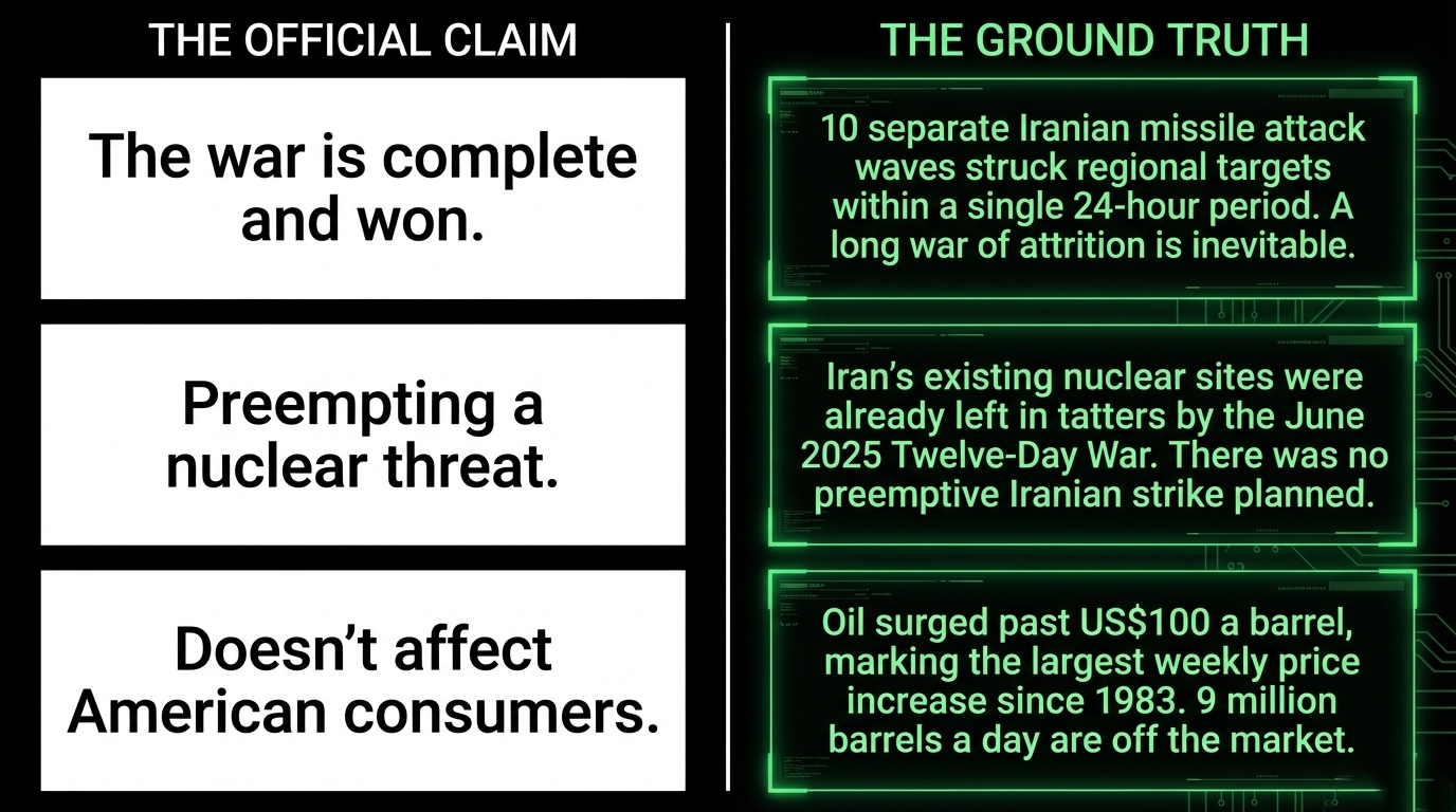 Trump stood before cameras and declared — as RNZ reported directly — that the war was "very complete, pretty much," that Iran has "no navy, no communications, no Air Force," as though the annihilation of a nation of 90 million people were a real estate deal signed and sealed. Meanwhile, as 1News reported on 8 March, Iranian missiles continued striking Israel, Hezbollah launched from Lebanon, and the Institute for the Study of War's evening special report of 7 March documented ten separate Iranian missile attack waves striking Israeli and regional targets within a 24-hour period. Trump's proclamation of victory was not a military assessment. It was a performance — spectacle dressed as strategy.