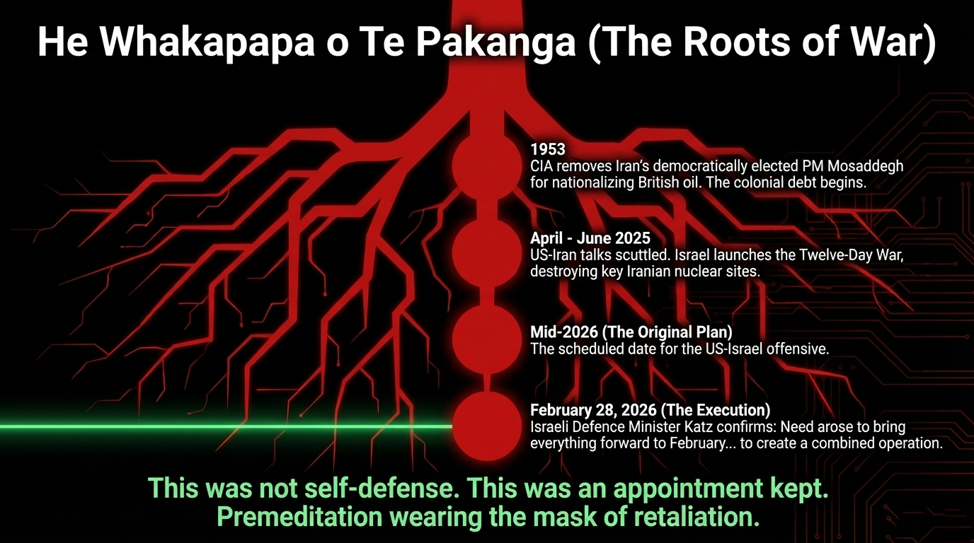 This is not a response. This is not self-defence. This is a scheduled act of imperial violence — and the whakapapa of this moment traces back not just to 1979, but to 1953, when the CIA removed Iran's democratically elected Prime Minister Mohammad Mosaddegh for daring to nationalise British oil. The west has been collecting its colonial debt from the Persian people ever since. The bombs of 28 February 2026 are only the latest instalment.