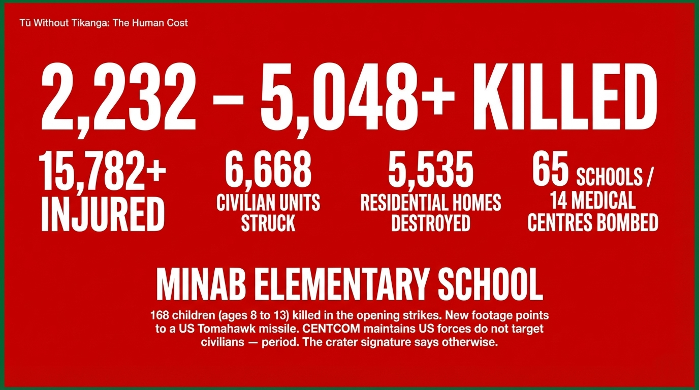 1News published new footage on 9 March raising the likelihood that the strike on Minab Elementary School — 168 children killed — was caused by a US Tomahawk missile. CENTCOM maintains "US forces do not target civilians — period." The footage and crater signature say otherwise. This claim is unresolved and demands independent investigation by the International Criminal Court. The girls had names. Their mothers have faces. Their whakapapa stretches back through Persia to the oldest human civilisations on earth. They were tangata — the greatest thing in the world — and they are gone.