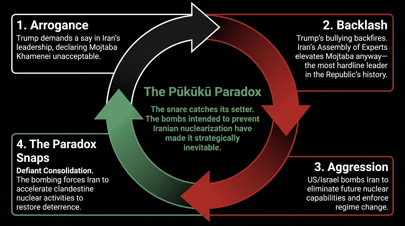 The Washington Institute for Near East Policy warned on 4 March that new Supreme Leader Mojtaba Khamenei "may pursue extreme options to restore deterrence," including "accelerating clandestine nuclear activities" and "exploring unconventional procurement channels for missile and nuclear capabilities." The bombs intended to prevent Iranian nuclearisation have made it strategically rational — even inevitable — under the new leadership. This is the Pūkūkū Paradox: the snare that catches its setter.
