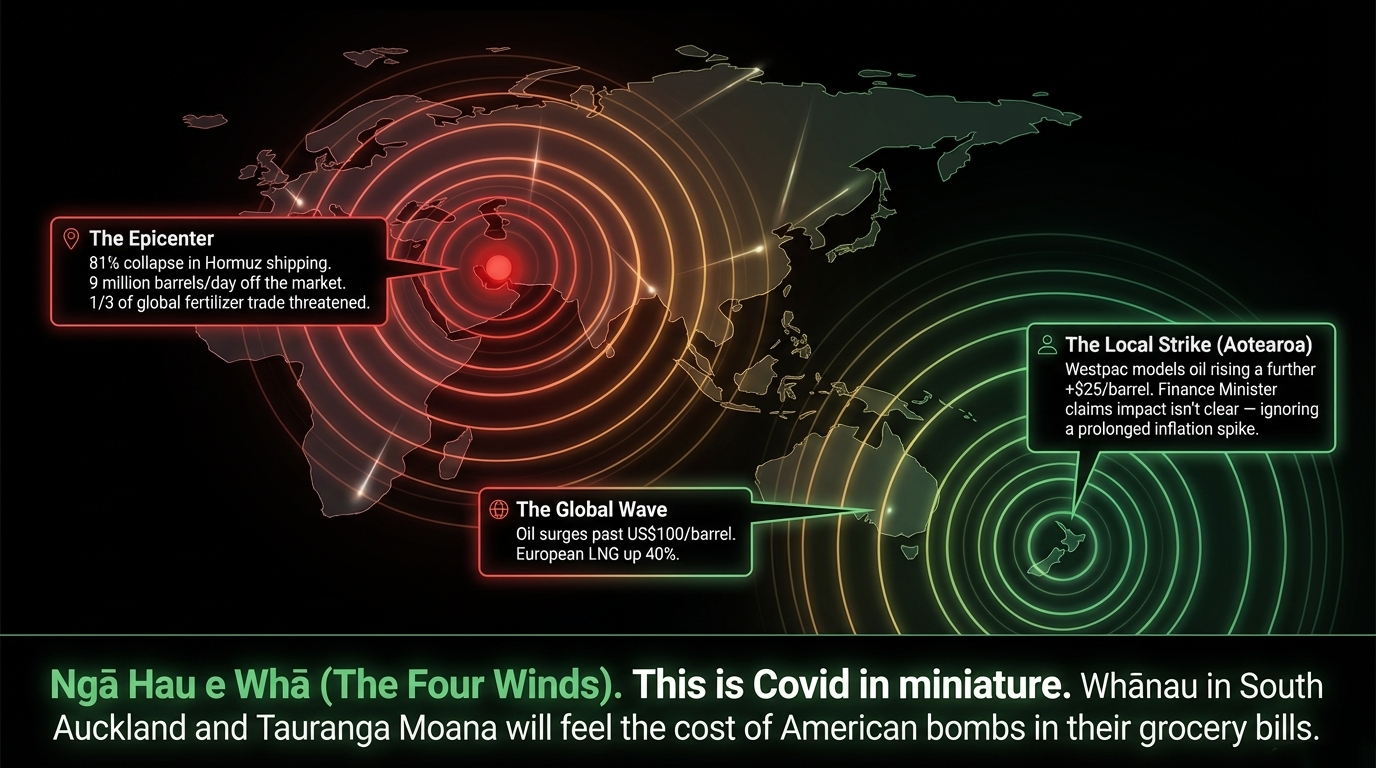 For Aotearoa New Zealand, RNZ reported on 4 March that Finance Minister Nicola Willis told parliament the economic impact "isn't clear." This is pōhēhē wearing a Budget 2026 suit. The same RNZ report confirmed that Westpac had already modelled oil rising a further US$25 per barrel. 1News reported on 8 March that New Zealand faces disruption "like Covid in miniature." Our whānau in South Auckland, in Tauranga Moana, in Gisborne and Whanganui — already stretched taut by three years of this government's cost-of-living indifference — will feel this war in their grocery bills before they feel it anywhere else. They always do.