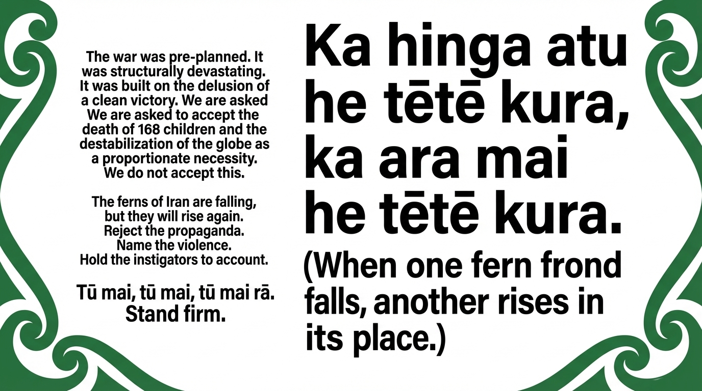 The ferns of Iran are falling. The ferns will rise again. The question for the rest of us — for the people of Aotearoa, for the peoples of the Pacific, for everyone downstream of Hormuz and downstream of empire — is whether we have the courage to stand now and say clearly: this was wrong, it was planned, it was unnecessary, and the ones who did it must be held to account.