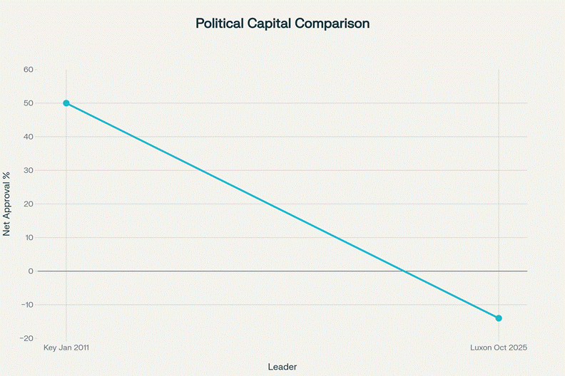 A critical historical pattern deserves emphasis: Key’s personal political capital grew steadily; Luxon’s has deteriorated since taking office.