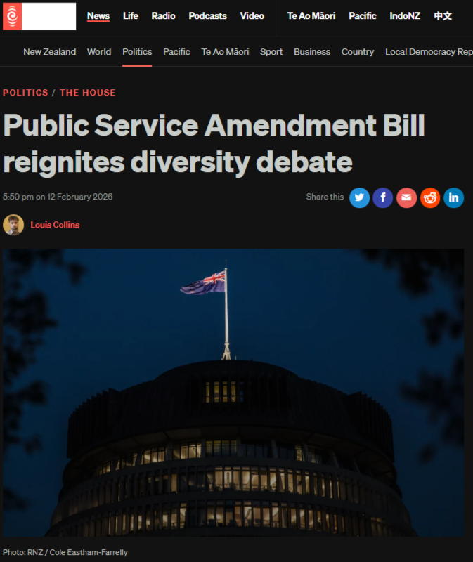 Tools used: RNZ page retrieval, public web search, file search for prior related material, NZ Parliament bill tracker, Treasury cabinet papers, Public Service Commission DEI guidance and reporting material.