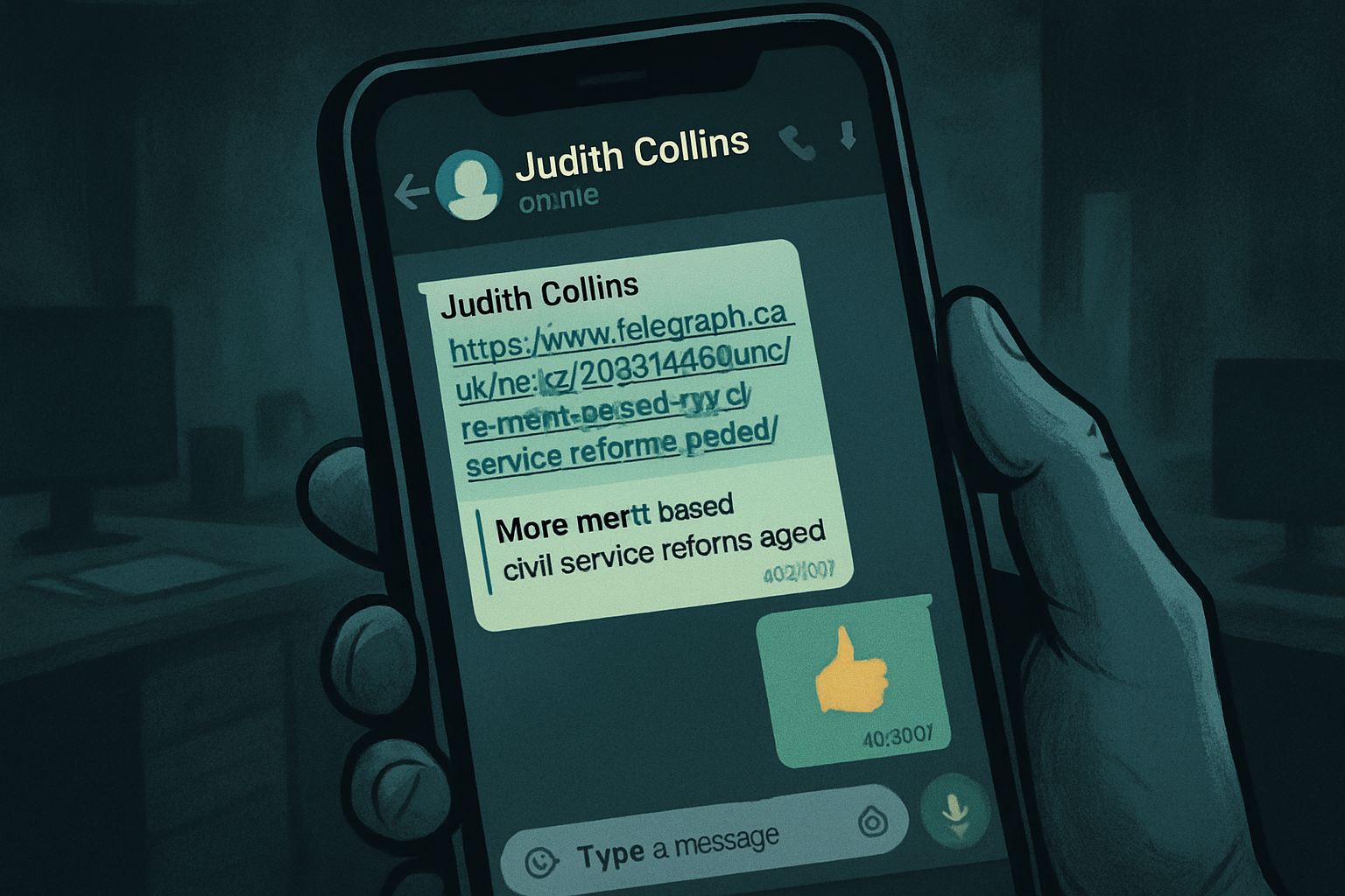 The leaked WhatsApp messages between Judith Collins and Public Service Commissioner Sir Brian Roche—obtained under the OIA and reported by NZ Herald—reveal the ideological pipeline behind the legislation. Collins sent Roche British Telegraph articles about "underperforming civil servants to be pushed out" under Keir Starmer's UK reforms. Roche replied: "This all makes a lot of sense and isn't too different from the situation we face".