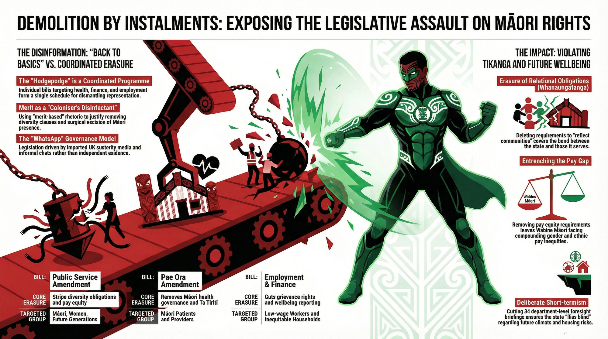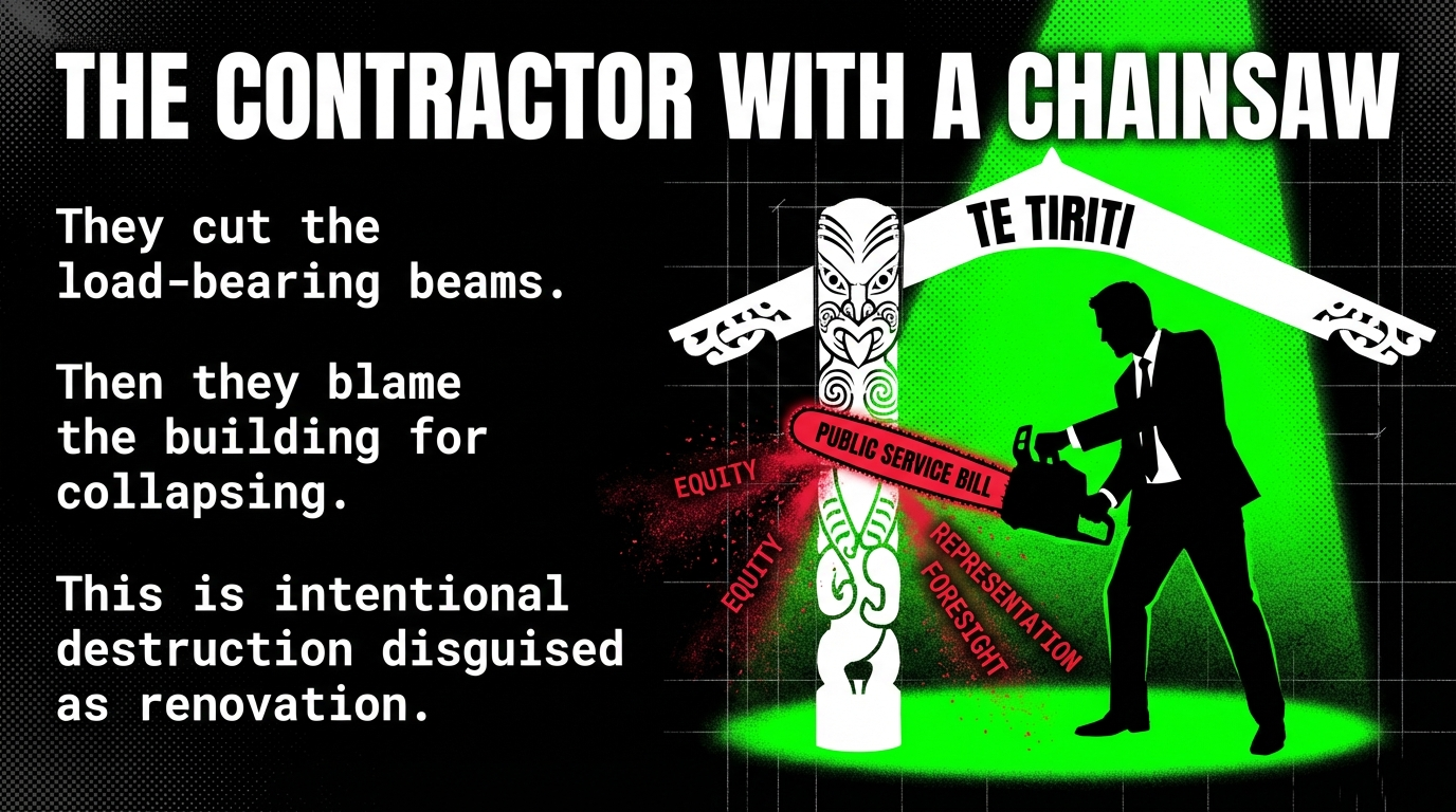 This coalition behaves like a demolition contractor hired by donors, arriving at the public service with a chainsaw and a clipboard. The clipboard says "merit" and "basics." The chainsaw hits the load-bearing beams: representation, pay equity, long-term public interest, tikanga capability, worker protection, Māori health governance, wellbeing measurement.
