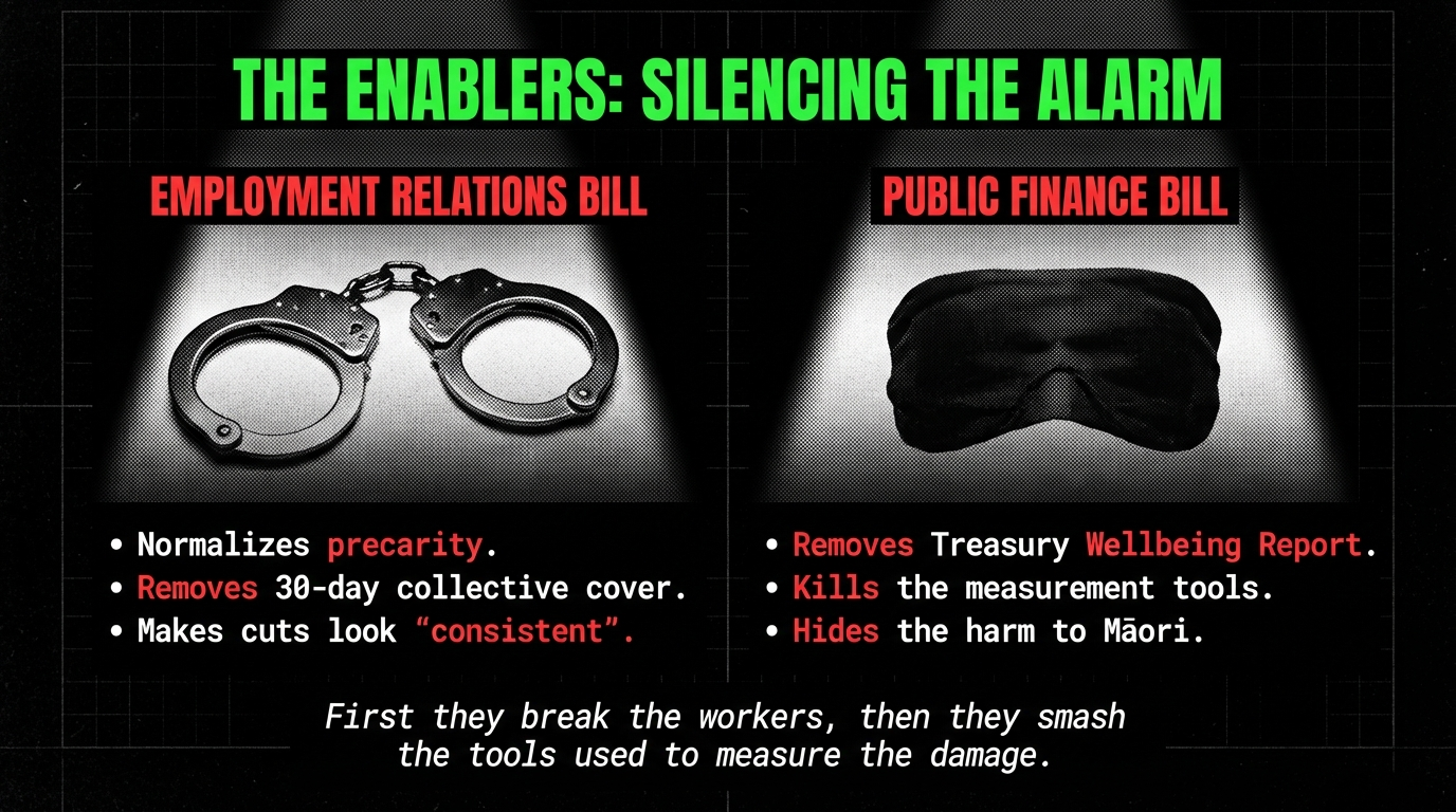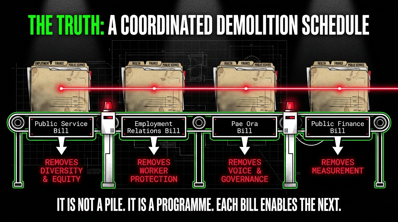 But the blueprint is visible. The parliamentary schedule is the delivery order. The Public Service Bill is the flagship demolition. The Employment Relations Bill weakens the workers who might resist. The Pae Ora Bill guts Māori voice in health. The Public Finance Bill destroys the instruments that would measure the wreckage. The Health and Safety Bill loosens the rules on who gets hurt.