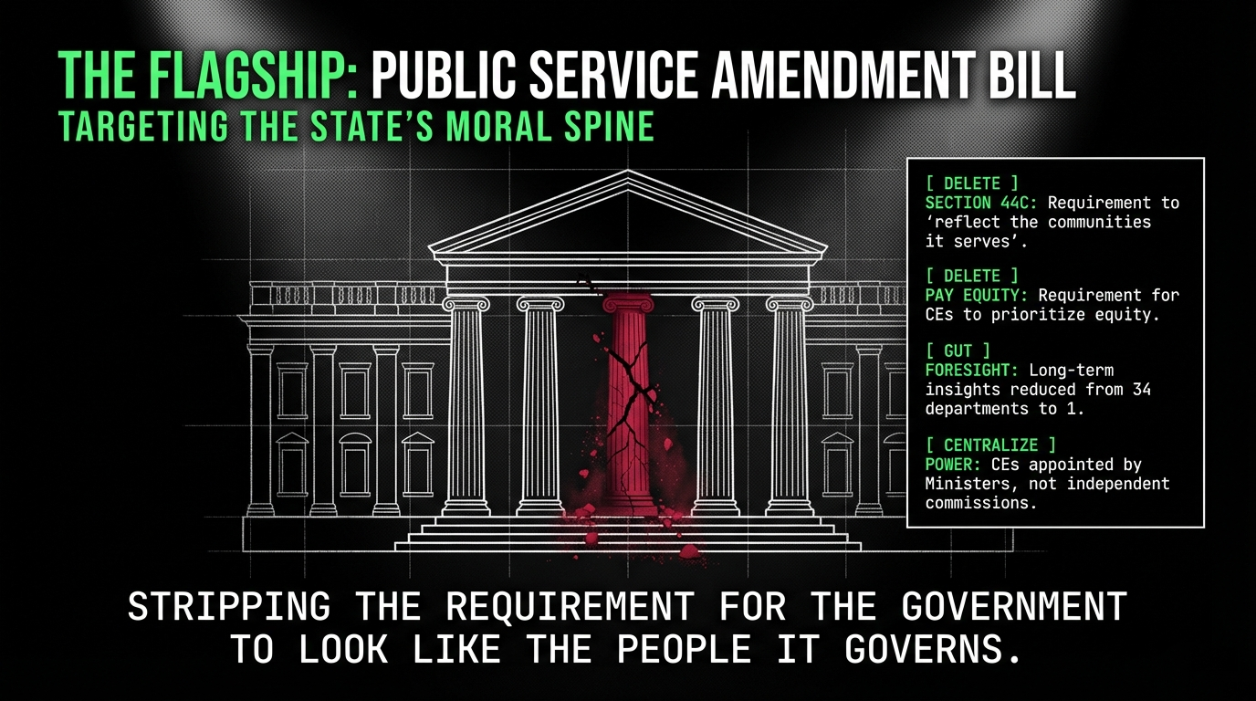 - The Public Service Amendment Bill: strips diversity obligations, pay equity, long-term insights, and hands chief executive appointments to ministers.