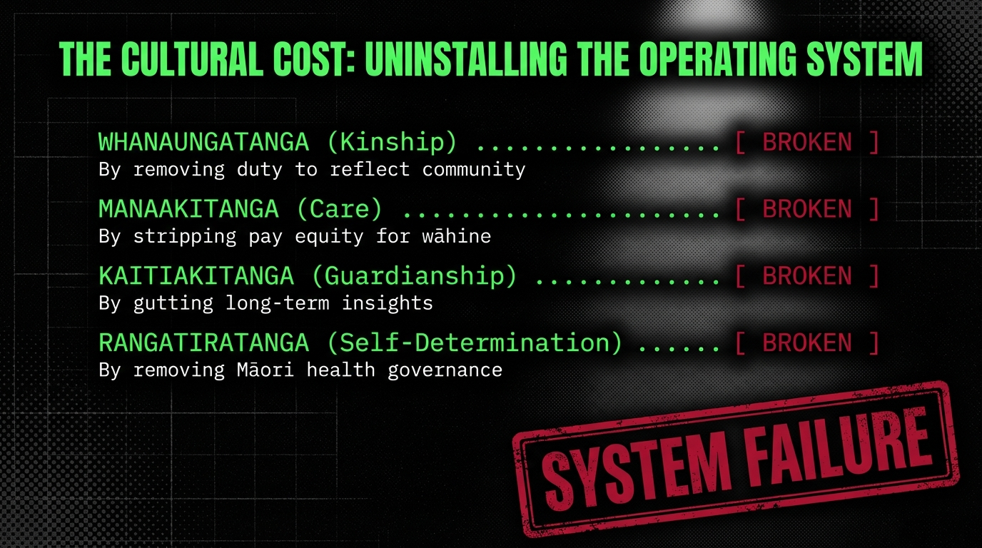 So the western translation is simple: imagine deleting "informed consent" from medical ethics, then claiming it is "back to basics." That is what this government does to tikanga-based obligations—removing the safety rails, then blaming the injured for bleeding.