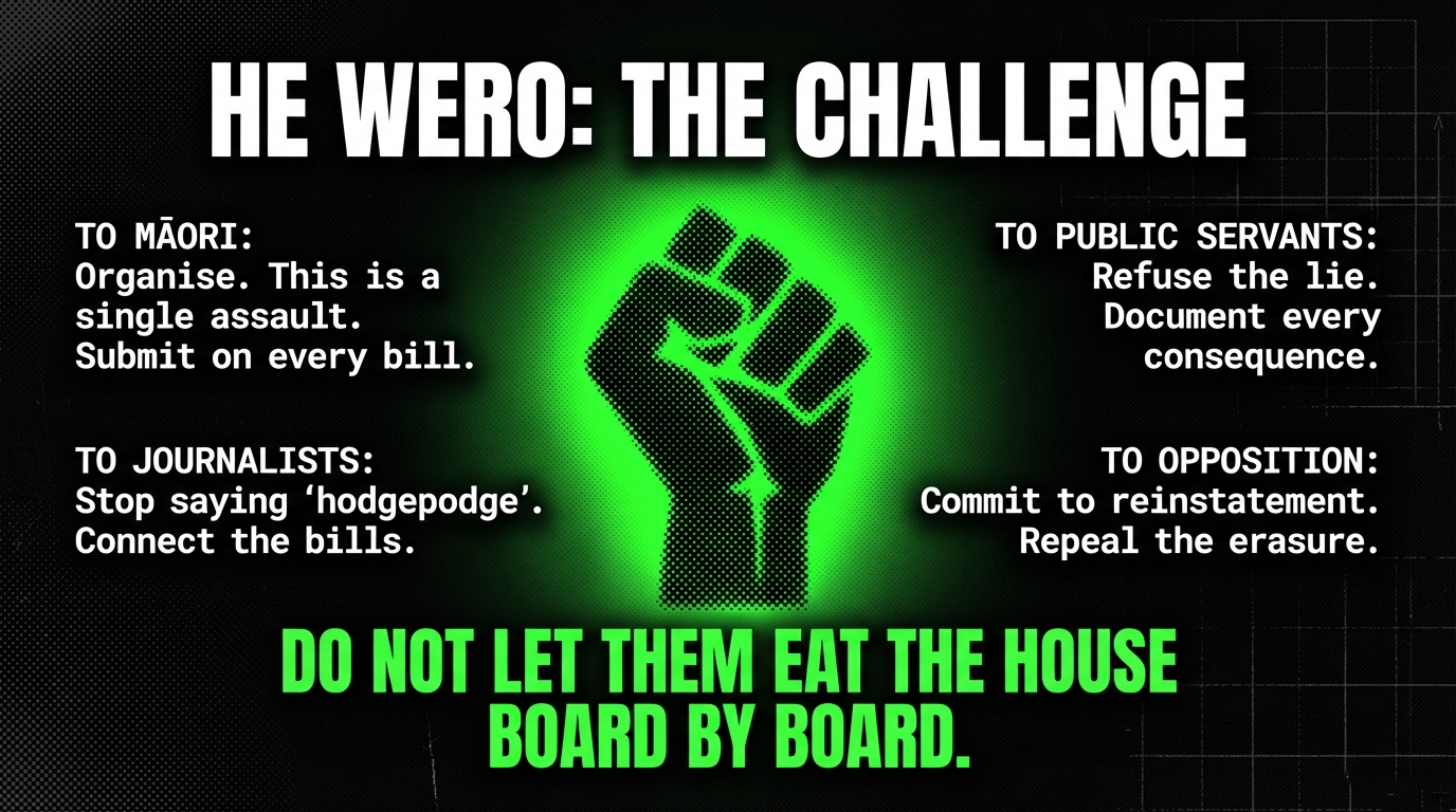 To journalists: Stop reporting this as a "hodgepodge." It is a programme. Map the connections between bills. Trace the coalition agreements that mandate each deletion. Ask Ryan Hamilton if he would say "you wouldn't pick the Māori boy" to a classroom full of tamariki.