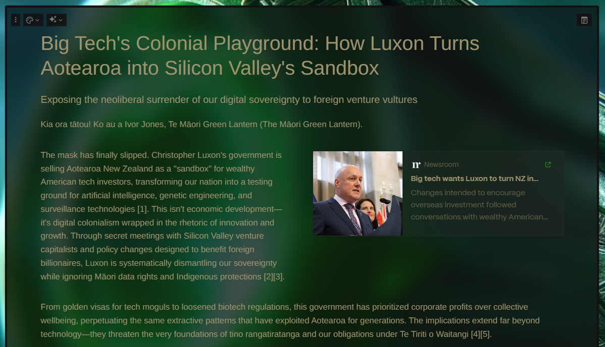 The mask has finally slipped. Christopher Luxon's government is selling Aotearoa New Zealand as a "sandbox" for wealthy American tech investors, transforming our nation into a testing ground for artificial intelligence, genetic engineering, and surveillance technologies 1. This isn't economic development—it's digital colonialism wrapped in the rhetoric of innovation and growth. Through secret meetings with Silicon Valley venture capitalists and policy changes designed to benefit foreign billionaires, Luxon is systematically dismantling our sovereignty while ignoring Māori data rights and Indigenous protections 23.