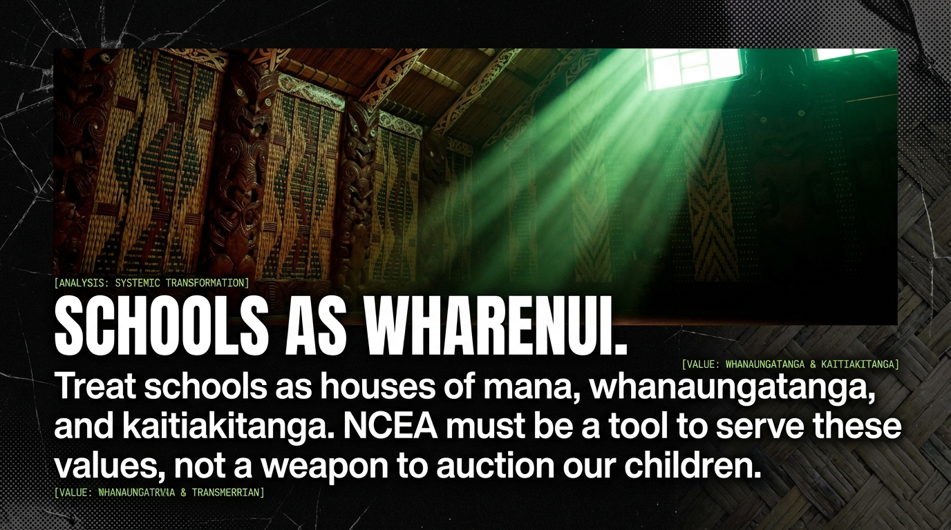 treat schools as wharenui of mana, whanaungatanga and kaitiakitanga, and treat NCEA and UE as tools that must serve those values, not weapons used to auction our children’s futures in a marketplace of fear. Mana Māori Kaitiakitanga – guardianship and conservation