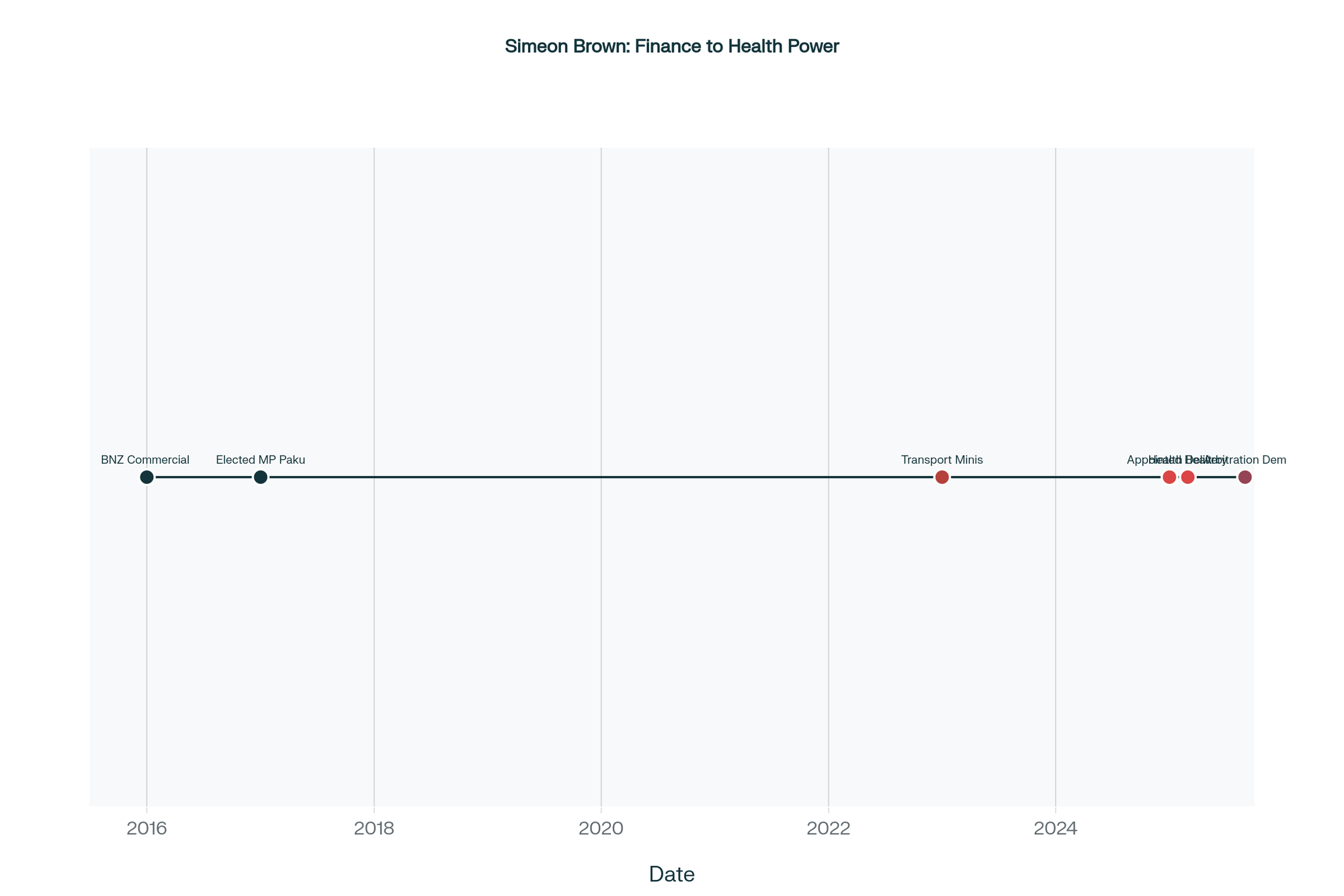 Timeline showing Simeon Brown's rapid political ascension from banking to controlling New Zealand's healthcare system