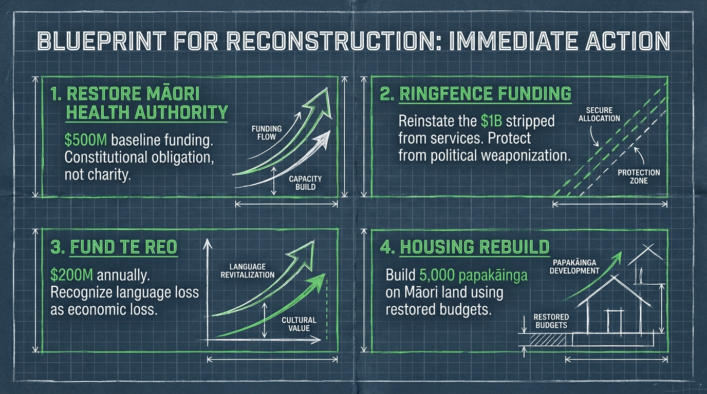 Restore the Māori Health Authority immediately with $500 million baseline funding—because Māori health is not charity, it’s a constitutional obligation under Te Tiriti.