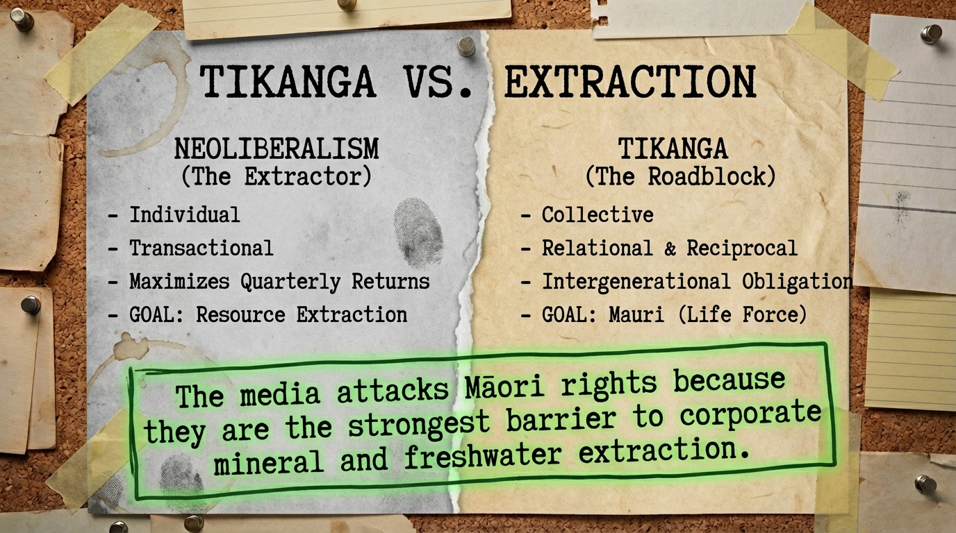 Tikanga is not “culture.” It’s not a museum piece. It’s constitutional law—the governance framework of Māori society, built on principles fundamentally opposed to neoliberalism:
