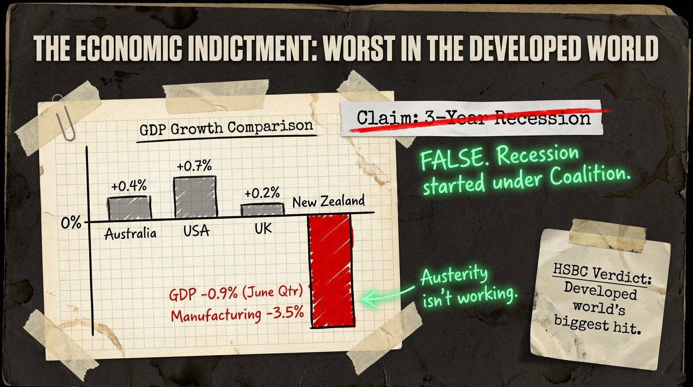 New Zealand’s economic performance under Luxon represents an unmitigated disaster. In September 2025, Statistics New Zealand revealed that GDP had contracted 0.9% in the June quarter—three times worse than the Reserve Bank’s forecast of 0.3% decline, as The Spinoff reported. HSBC chief economist Paul Bloxham described New Zealand as suffering “the developed world’s biggest hit” in 2024, with annual GDP falling 0.5% that year.