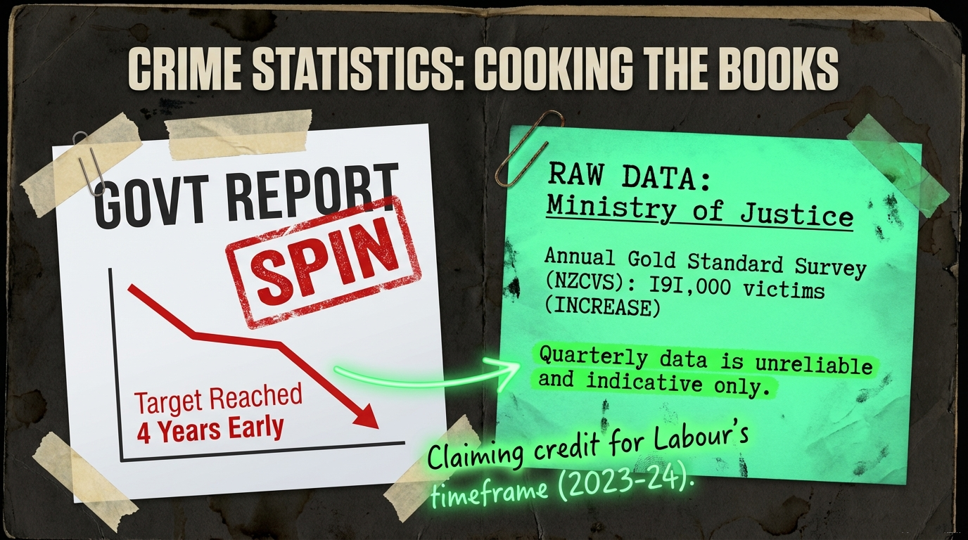 Here’s what actually happened: In February 2025, the Ministry of Justice released the authoritative annual New Zealand Crime and Victims Survey (NZCVS) Cycle 7 results showing 191,000 violent crime victims—an increase from the baseline of 185,000, though not statistically significant, as The Spinoff reported. The Government issued no press release about this most reliable, “gold-standard, statistically sound” data point.