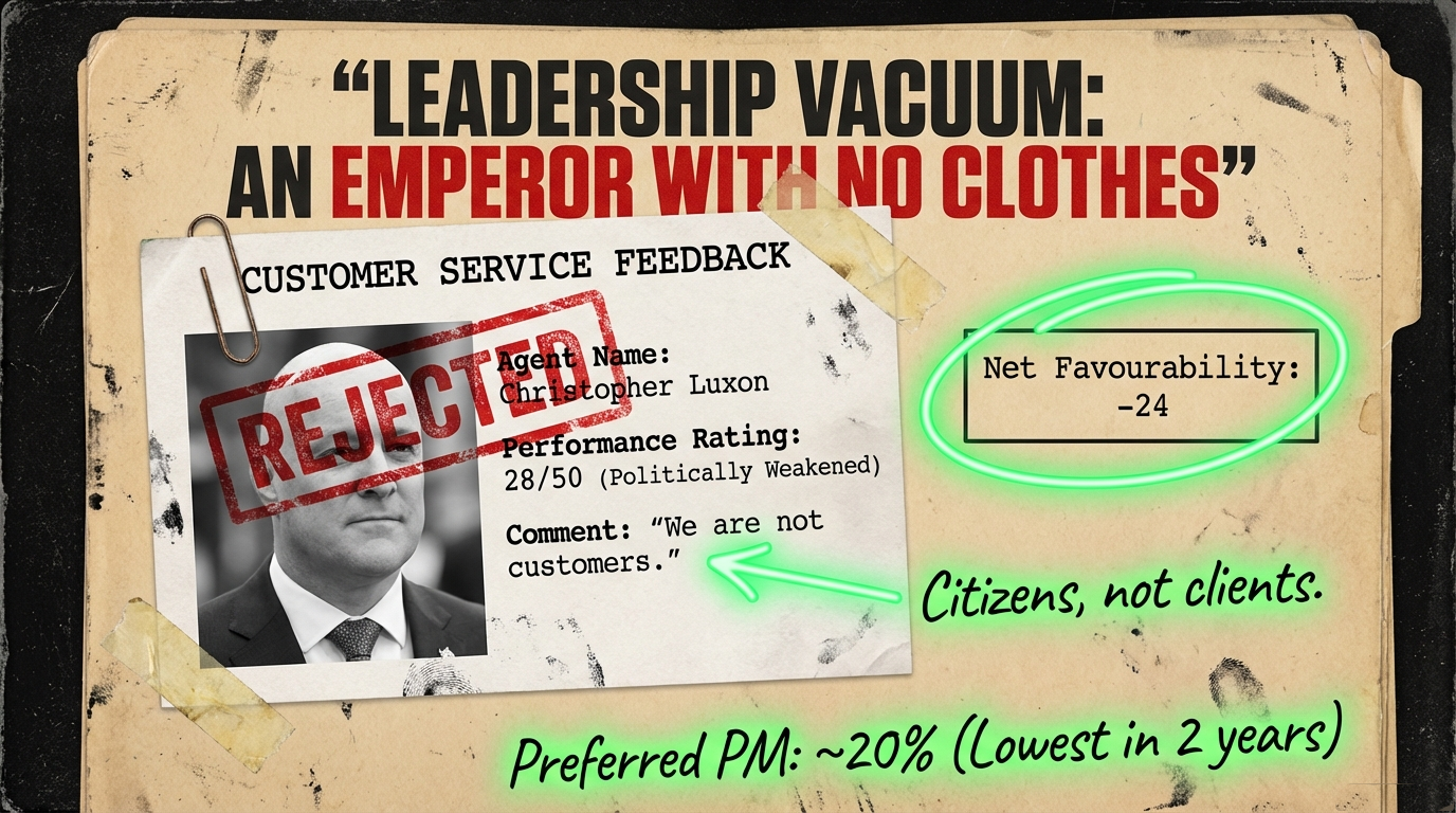 Christopher Luxon’s State of the Nation speech offers platitudes and distraction from a government defined by leadership failure, statistical manipulation, broken promises, economic catastrophe, and moral cowardice. At 51% of New Zealanders recognize him as out of touch, his net favourability at -24, and his own caucus discussing replacement, the electoral verdict is clear: this is a prime minister unsuited to office.