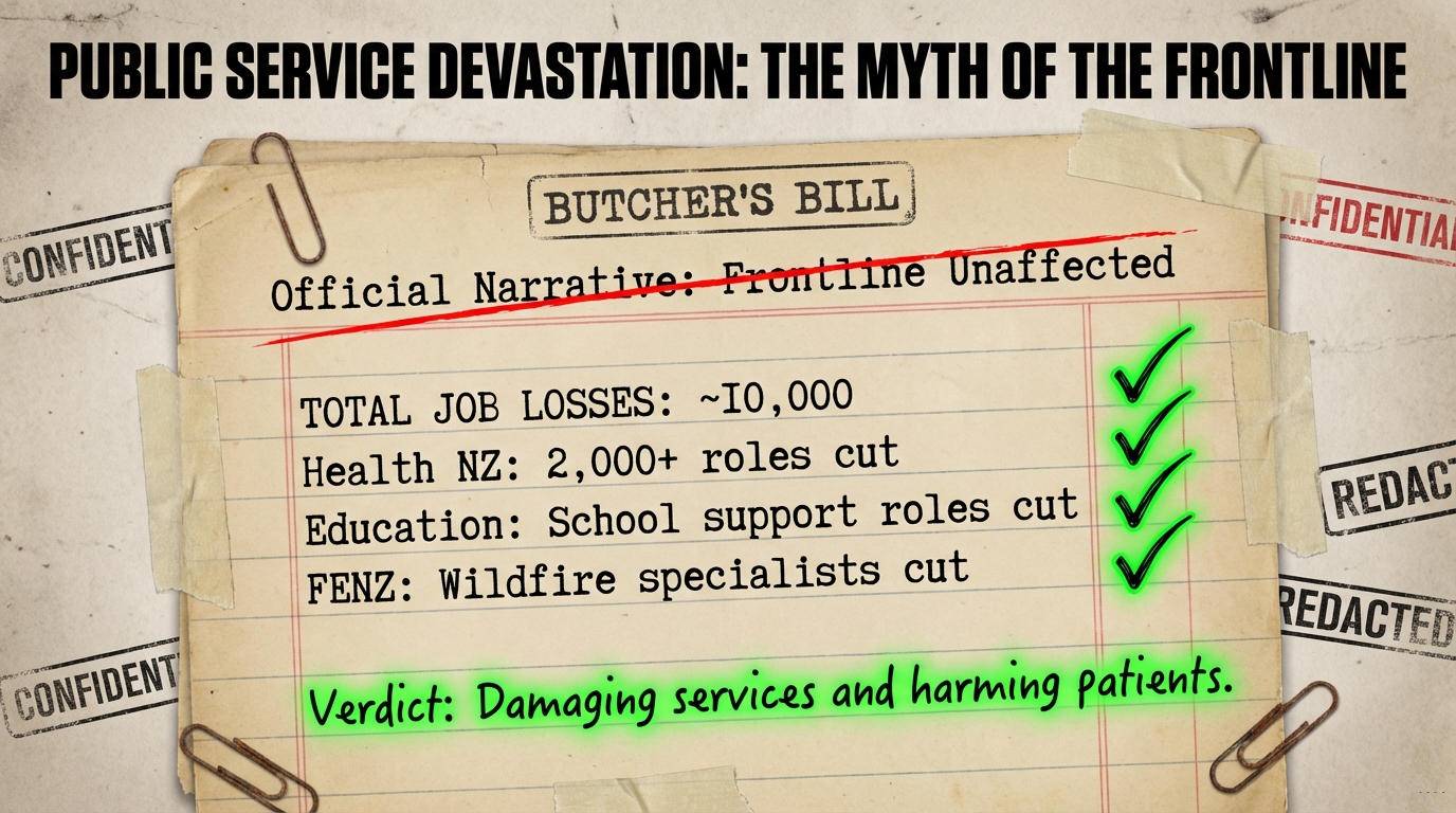 The Government repeatedly promised that cuts would not affect frontline services—a claim exposed as demonstrably false. Healthcare workers reported in surveys that cuts were “damaging services” and “harming patients,” as RNZ reported. Fire and Emergency launched its biggest restructure in eight years, cutting at least 140 positions—including wildfire specialists—while facing criticism that it would “impact FENZ’s ability to deal with emergencies,” according to RNZ.