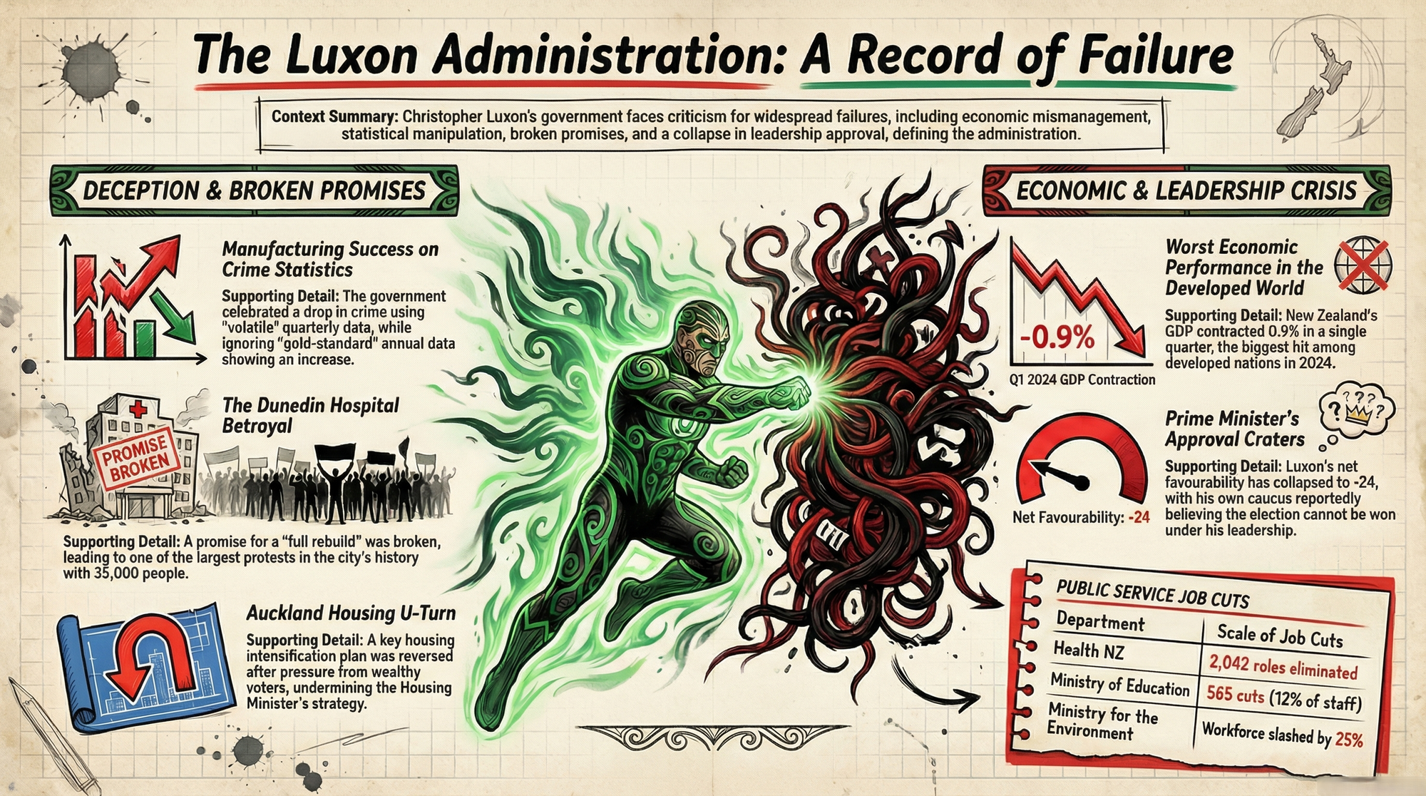 This essay documents how a prime minister has criminally manipulated crime statistics, betrayed 35,000 Dunedin residents who marched against broken promises, presided over the developed world’s worst economic performance, and remained silent while America invaded a sovereign nation. These are not abstract criticisms. They are documented failures of governance—failures that demand scrutiny beyond what mainstream outlets will provide.