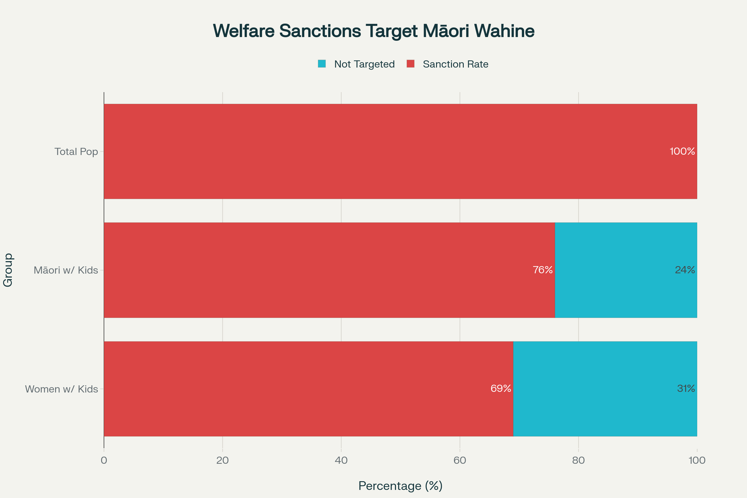 Chart revealing how welfare sanctions disproportionately target Māori women with children, exposing systemic colonial violence