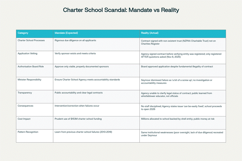 In November 2025, New Zealand’s charter school policy suffered a catastrophic governance failure that exposes the systemic incompetence and ideological recklessness at the heart of Associate Education Minister David Seymour’s education agenda. The Charter School Agency—the flagship institution designed to implement Seymour’s signature policy—signed a legally binding contract to establish a $10+ million sports charter school with a non-existent trust entity that did not exist on the Charities Register. This failure reveals not merely administrative incompetence, but a pattern of institutional negligence, ministerial abdication of accountability, and the subordination of due diligence to ideological speed.[1][2][3]