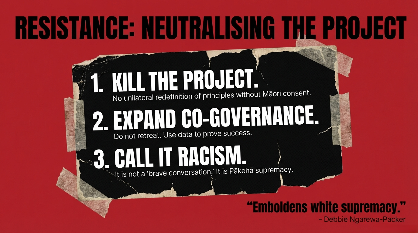 Māori leaders who have labelled Seymour’s politics as emboldening white supremacy, or likened his constitutional tinkering to KKK‑style control, are reading him correctly, as recorded in statements by Debbie Ngarewa‑Packer and Rawiri Waititi reported in 1News and RNZ. Pākehā commentators, academics and institutions need to stop laundering his project as “brave conversations” and call it what it is: a bid to re‑establish Pākehā supremacy under the banner of liberalism. - Strengthen Te Tiriti‑Literate Education and Media